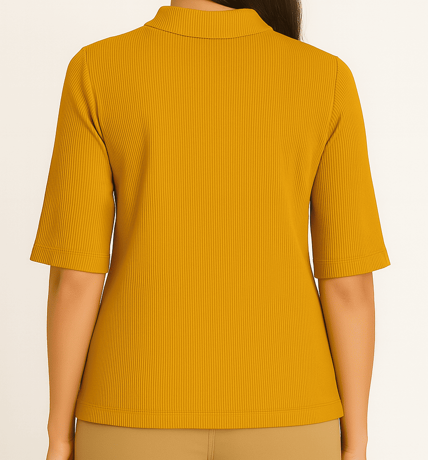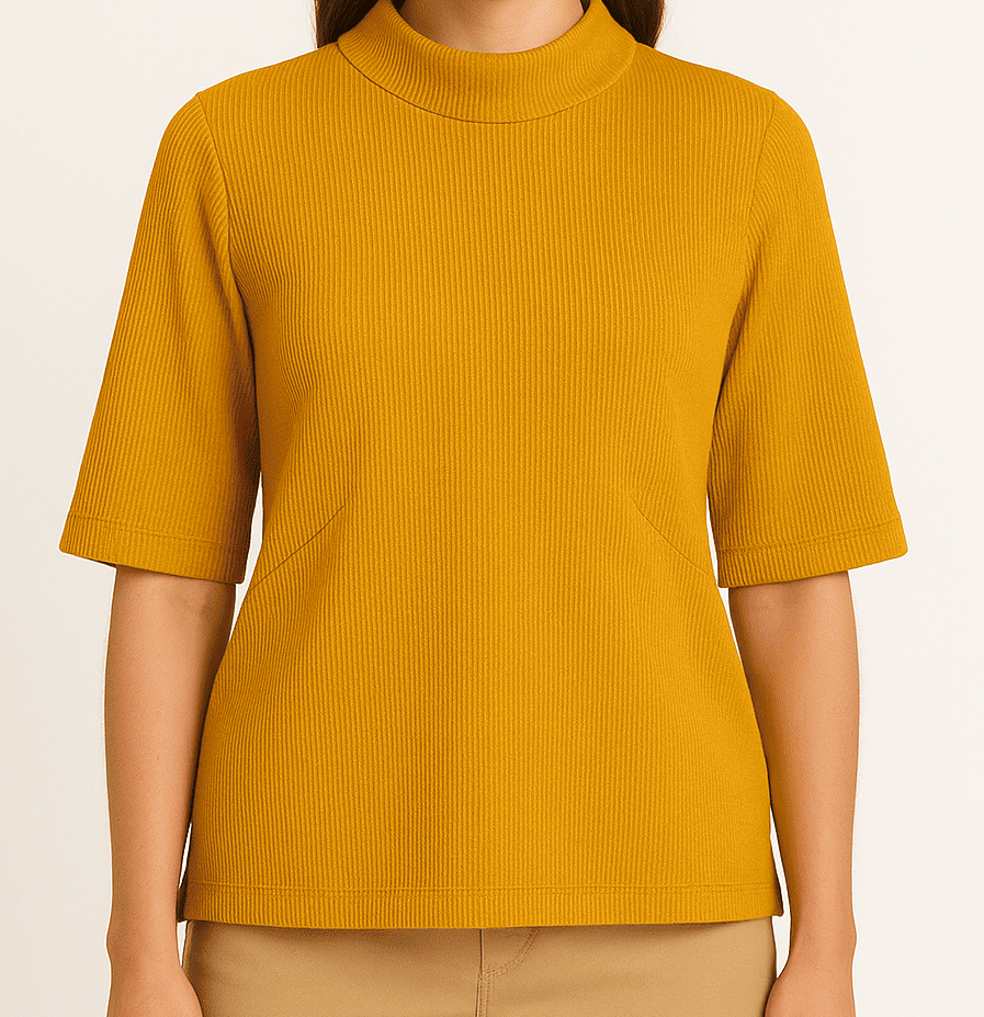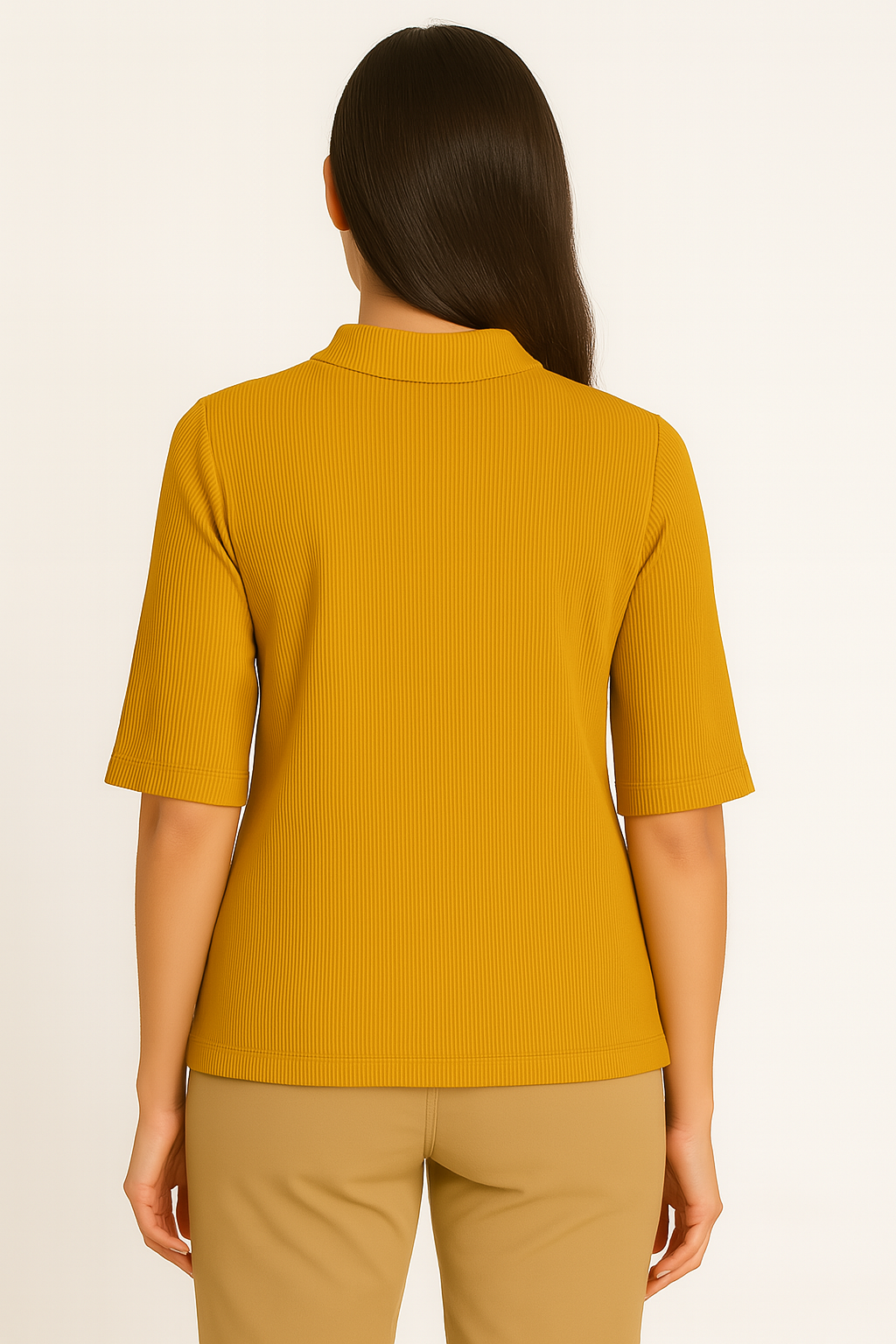 This mustard yellow ribbed knit top offers a blend of comfort and modern style. Featuring a structured mock neck and half sleeves, it provides a neat, tailored look with subtle vertical ribbed texture. Made from stretchable fabric, this slim-fit top contours the body gracefully, making it perfect for casual outings or layering under blazers. The solid back and clean hemline complete the minimal yet chic design.