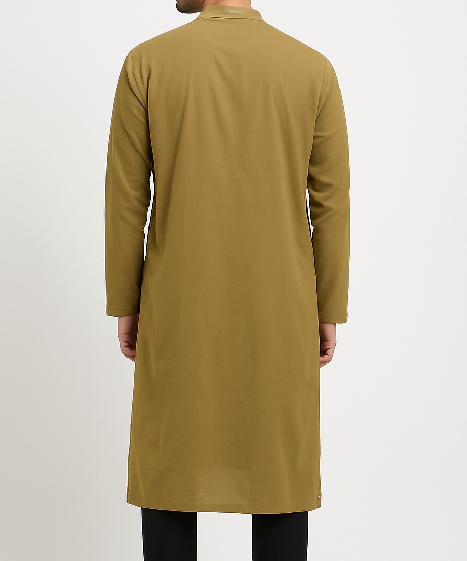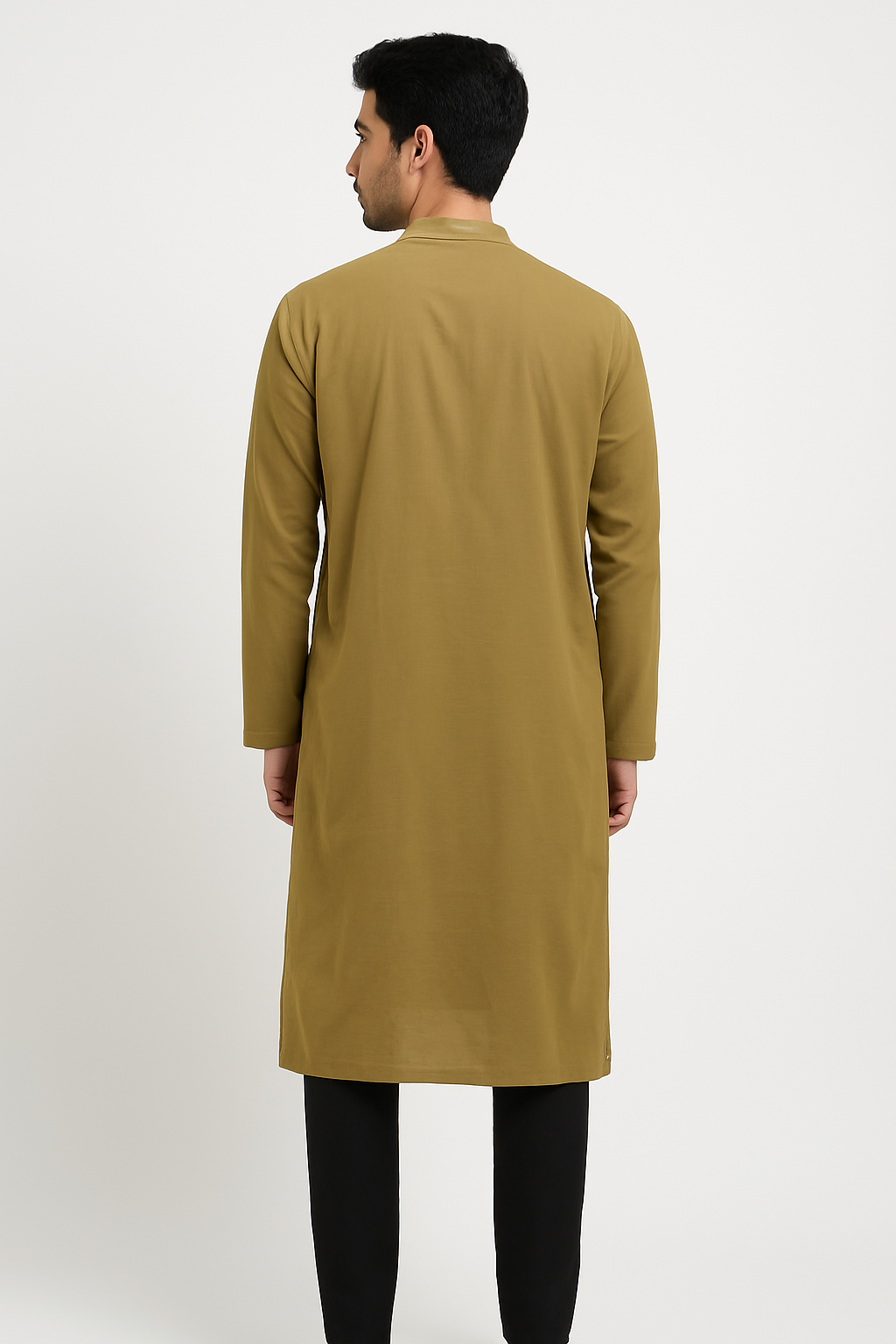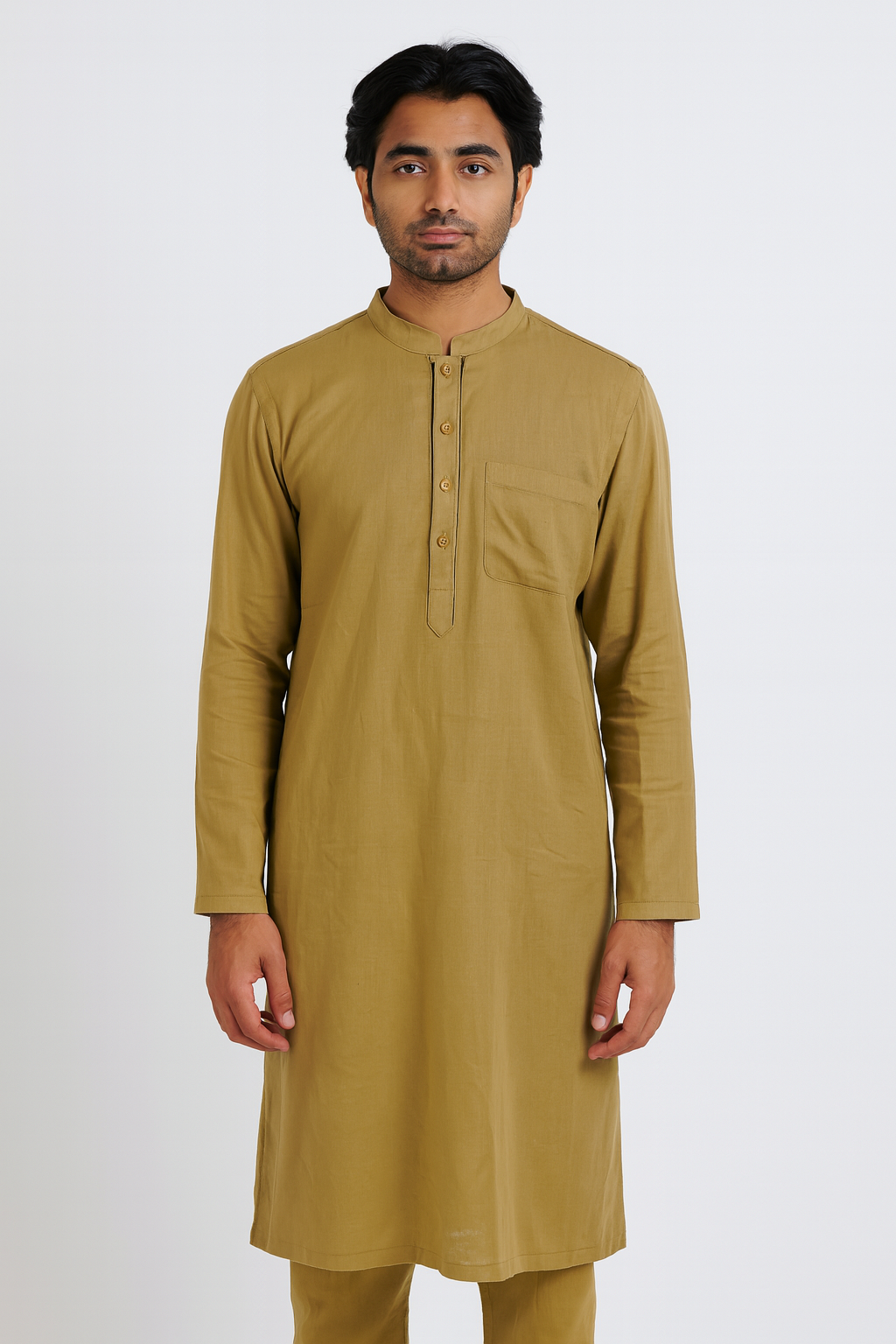 This men’s mustard cotton kurta combines traditional style with modern minimalism. It features a classic mandarin collar, a four-button placket with matching buttons, and a functional chest pocket for added utility. The straight-cut silhouette with full sleeves ensures comfort and a polished look, while the breathable cotton fabric offers all-day ease. Ideal for festive occasions, cultural gatherings, or casual ethnic wear.
