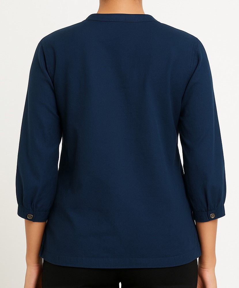 This women’s kurti top in navy blue is designed for both comfort and elegance. Crafted from soft cotton fabric, it features delicate embroidered detailing on the front panel, adding a touch of charm. The kurti comes with a mandarin neckline and wooden-look button placket, making it versatile for casual and semi-formal wear. The 3/4 sleeves with buttoned cuffs and straight hem ensure a neat silhouette. Ideal for office, casual outings, or everyday wear, this top pairs perfectly with trousers, leggings, or jeans.