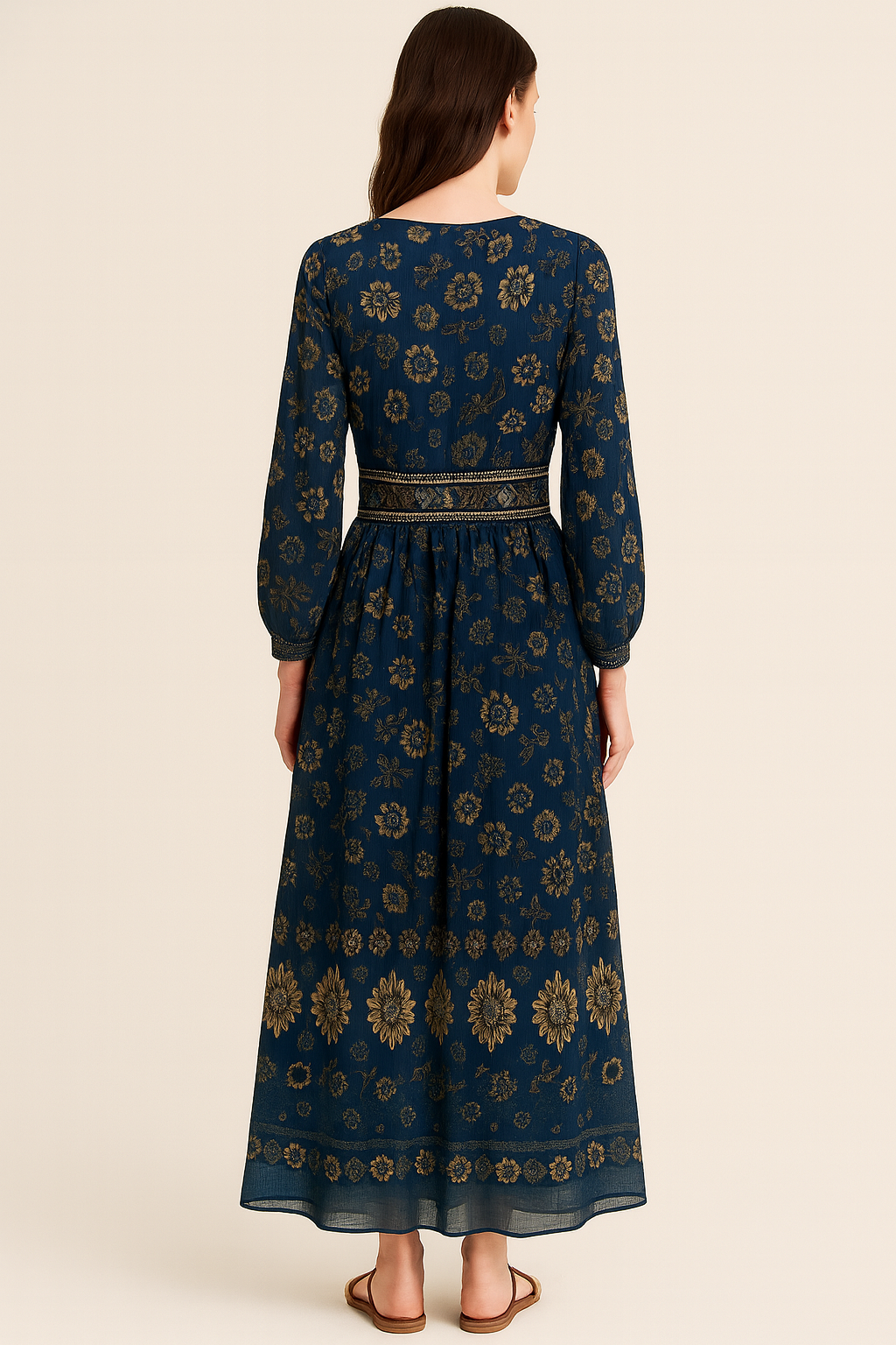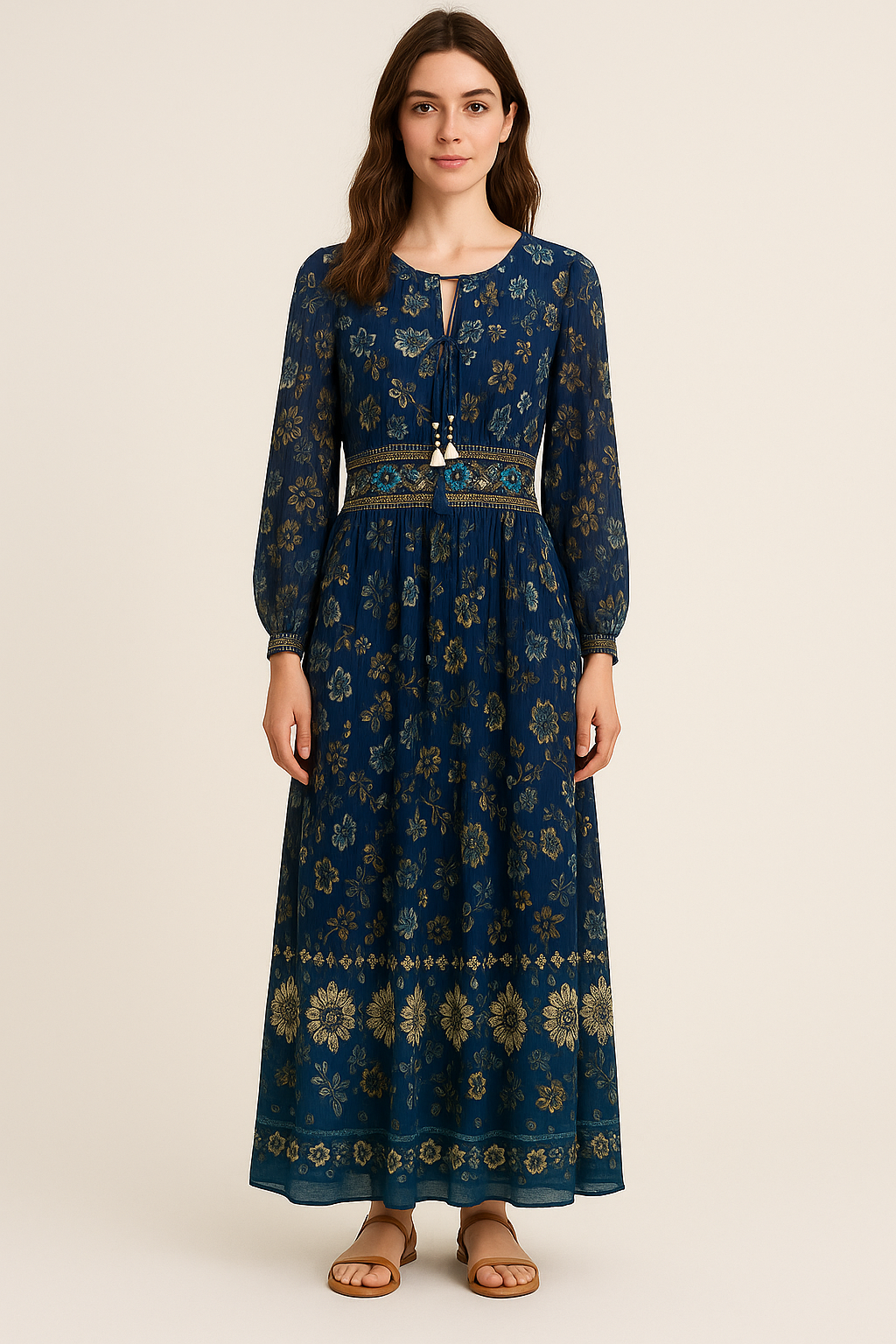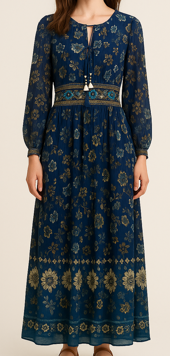 Embrace effortless elegance with this navy blue maxi dress adorned in intricate gold foil floral prints. Crafted from a lightweight and breathable fabric, this full-sleeve dress features a flattering empire waist enhanced with embroidered detailing and tassel ties at the neckline. The flowy silhouette and ankle-length hem offer a timeless, graceful look perfect for festive occasions or casual gatherings. Its bohemian aesthetic, detailed gold motifs, and classic dark blue hue create a captivating ensemble.