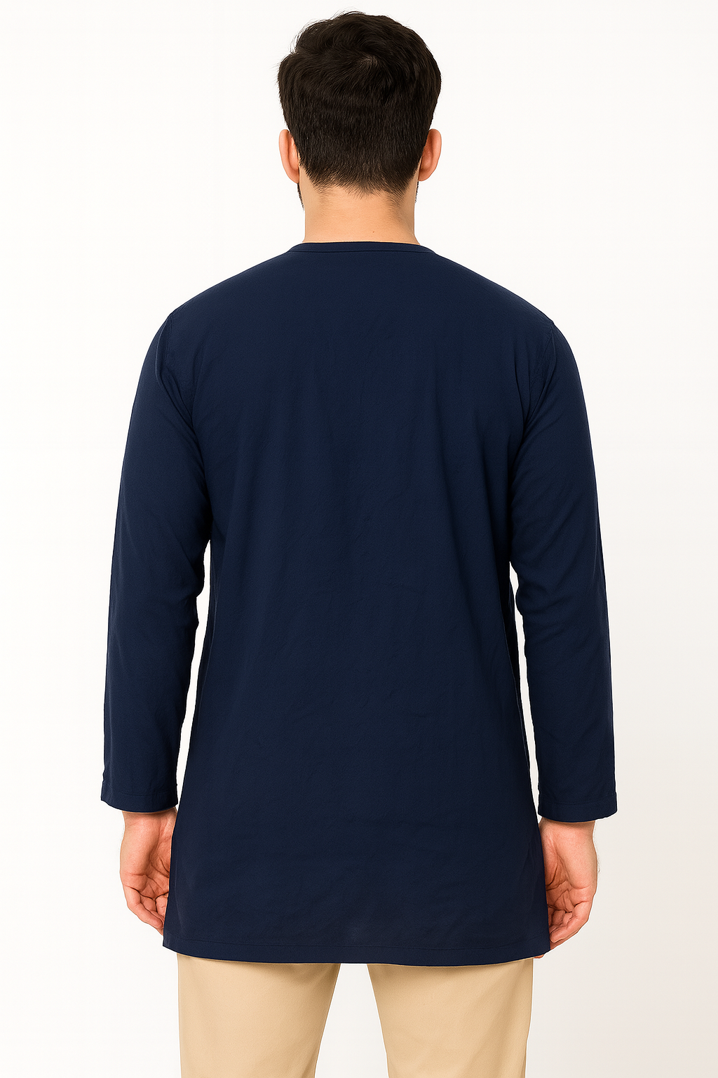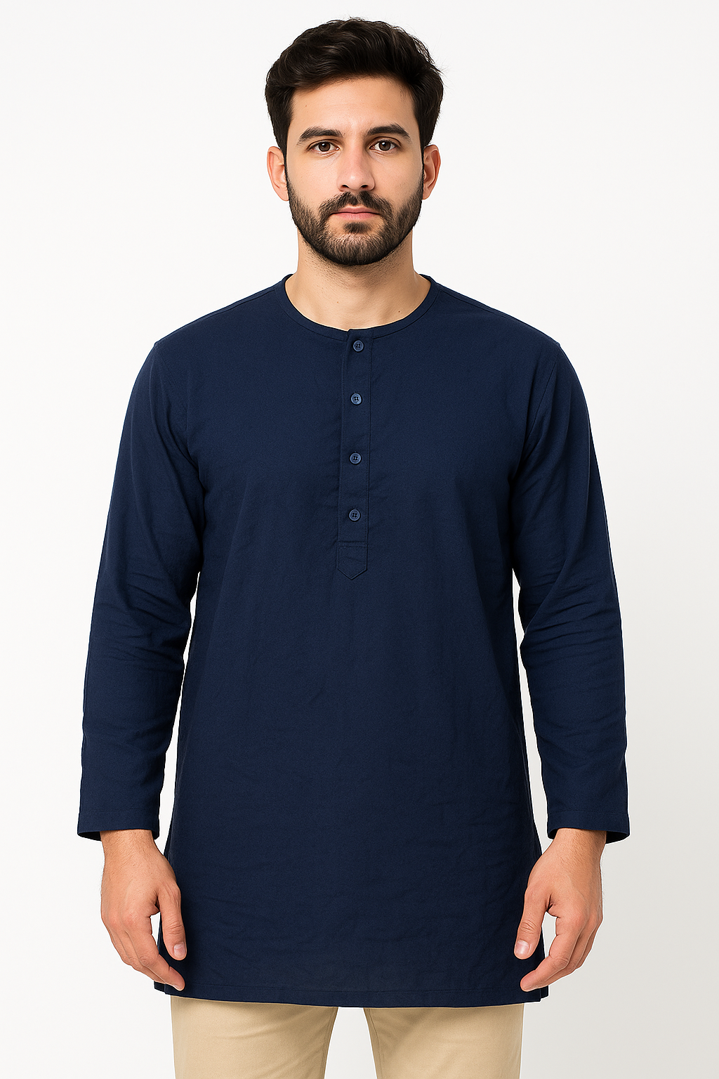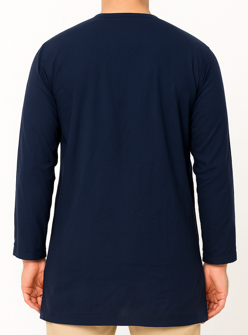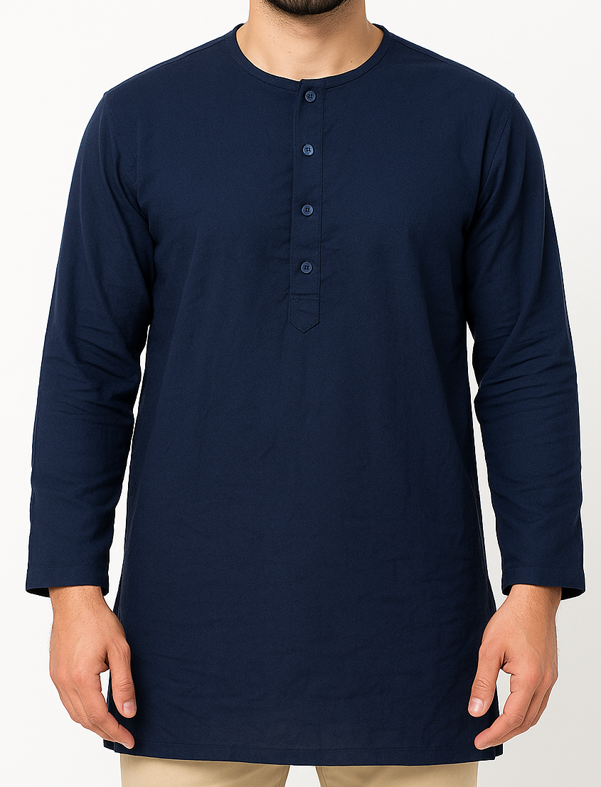 Elevate your ethnic wardrobe with this elegant men’s kurta in classic navy blue. Crafted from soft cotton fabric, this full-sleeve kurta features a round neck and a sleek button placket for a modern yet traditional look. Designed for comfort and style, it’s perfect for casual gatherings, festive occasions, or everyday wear. The straight hem and solid color make it versatile and easy to pair with churidars, jeans, or trousers.