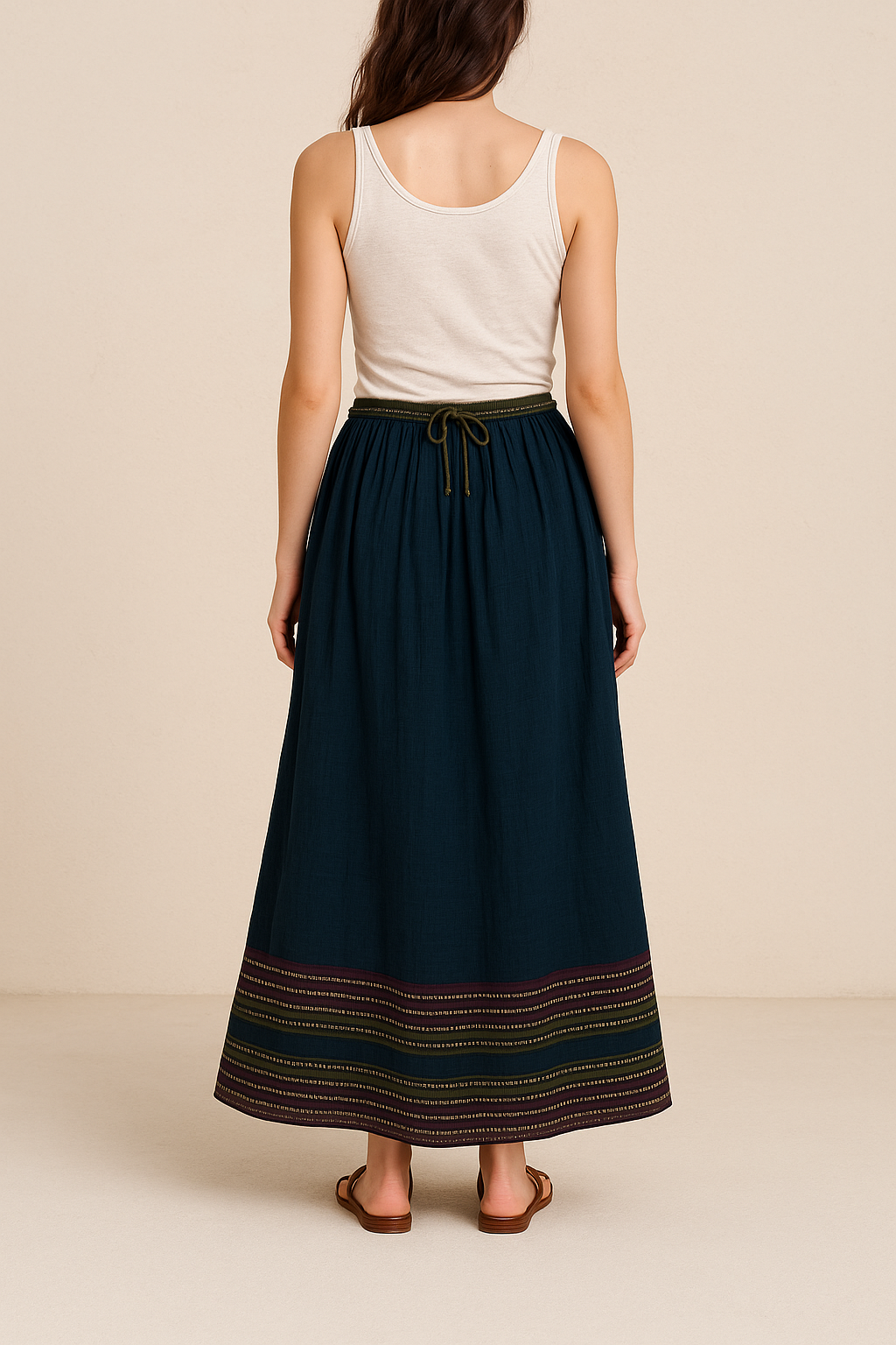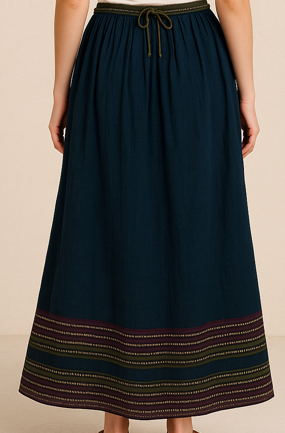 This elegant navy blue A-line skirt features a gathered high-waist design with a drawstring tie for adjustable comfort. Crafted from soft, breathable cotton, the skirt flows gracefully to calf-length, ending in a beautifully embroidered border with maroon, olive green, and golden threadwork. Its rich texture and ethnic pattern make it a versatile piece suitable for casual outings, festive occasions, or ethnic styling.