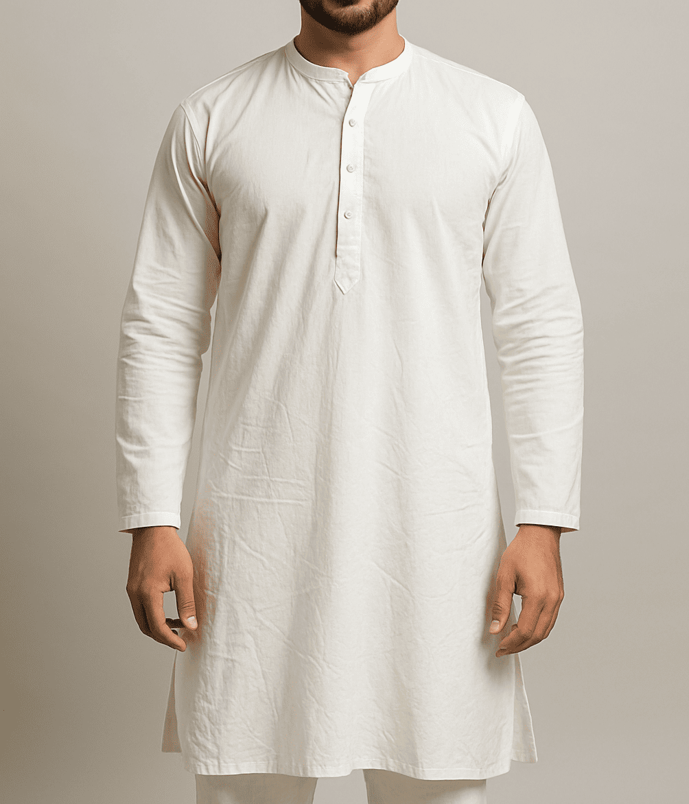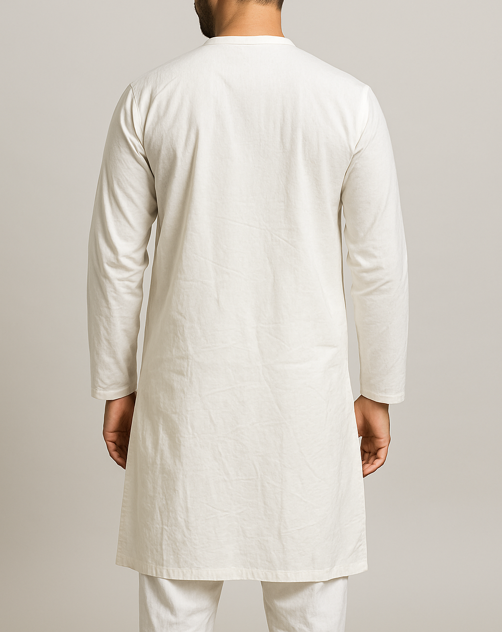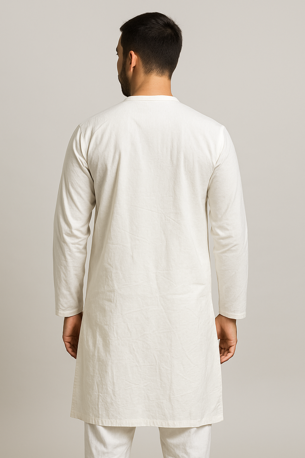 Embrace elegance and comfort with our classic off-white cotton kurta for men. Crafted from breathable and soft pure cotton, this kurta features a clean mandarin collar, half-button placket, full sleeves, and a relaxed straight-cut design. Ideal for festive occasions, casual wear, or traditional gatherings, it ensures a timeless look while keeping you cool and comfortable all day.