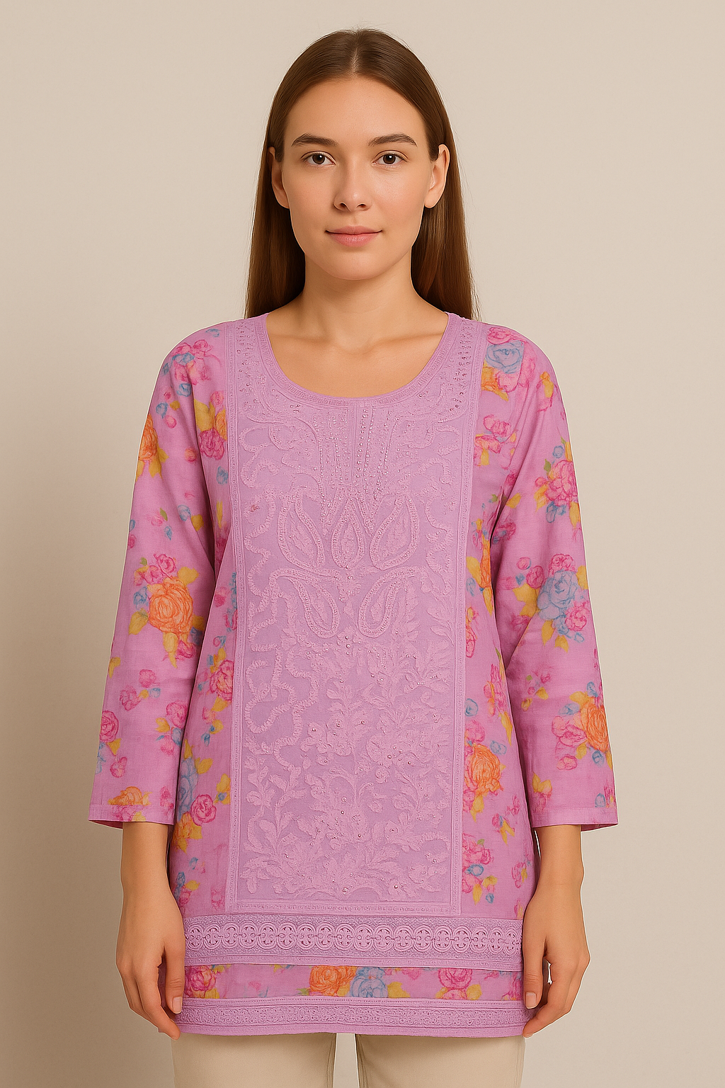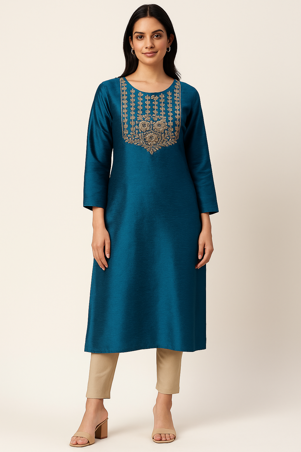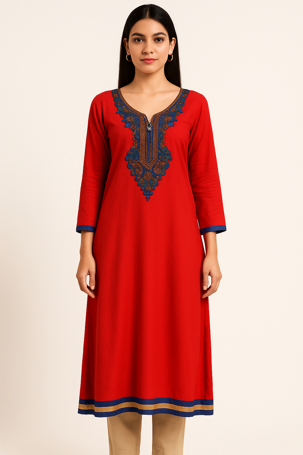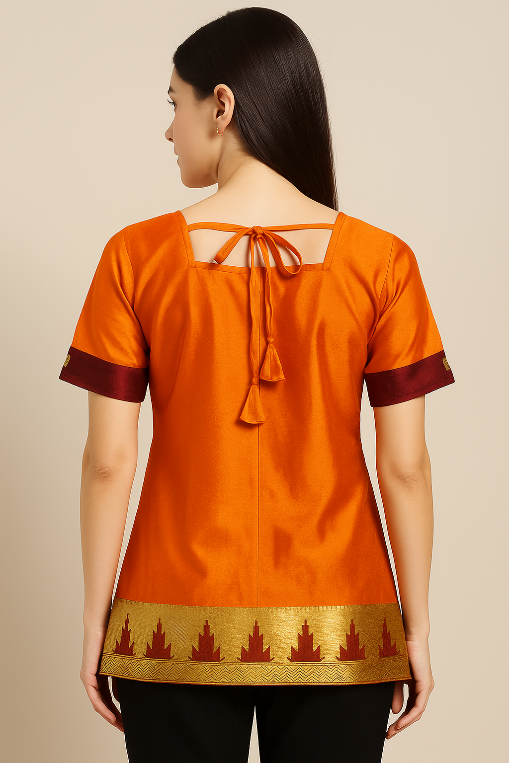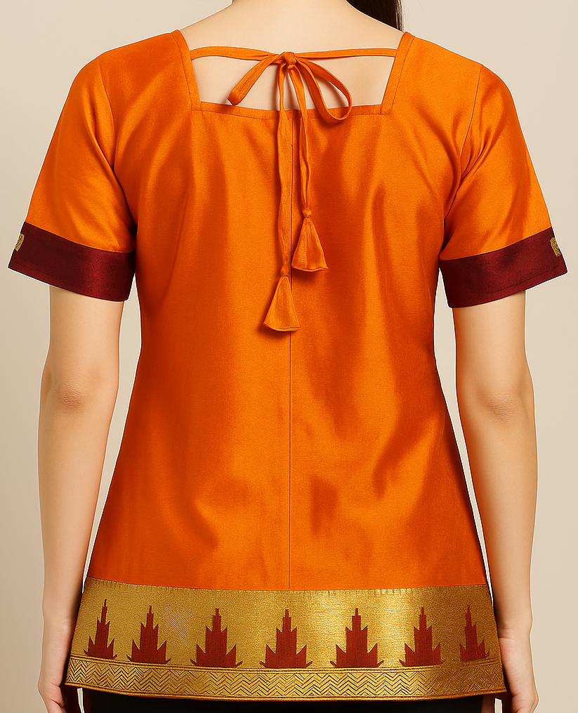 This vibrant orange short choli, crafted from a lustrous silk-blend fabric, showcases traditional aesthetics with modern charm. The front features a delicately embroidered teardrop paisley motif in maroon, green, and golden threads, accentuated by a geometric patch below the square neckline. The short sleeves are bordered with contrasting maroon bands and golden button detailing, while the hemline is adorned with a rich golden zari border featuring maroon temple-style motifs. The back adds a graceful touch with a tie-up detail and tassels, enhancing the traditional appeal. Perfect for festive or semi-formal occasions.