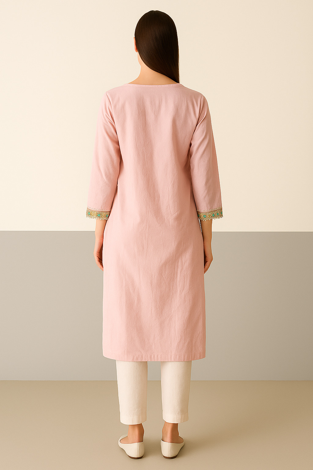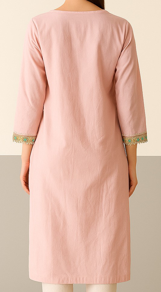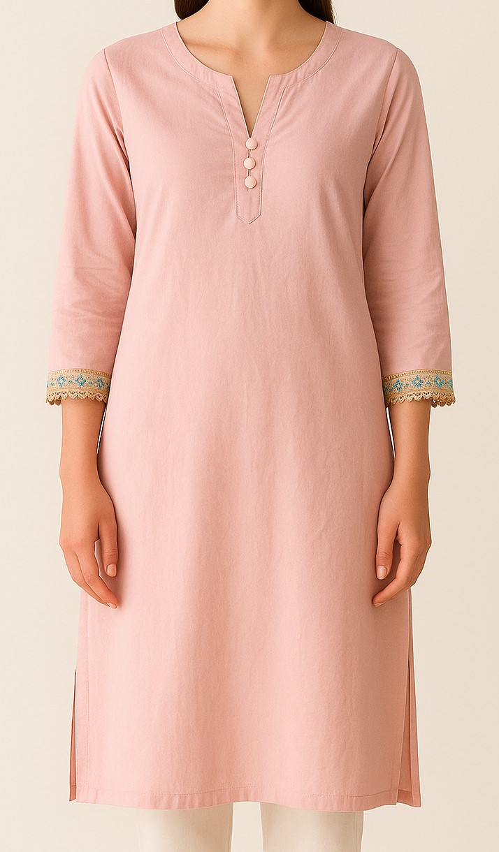 This elegant pastel pink straight kurta exudes simplicity with a touch of grace. Designed with a straight cut and side slits for easy movement, the kurta features a modest V-slit neckline adorned with fabric buttons and delicately embroidered sleeve cuffs with lace detailing. Crafted from soft, breathable fabric, it’s ideal for both casual days and festive gatherings when paired with trousers or palazzos.
