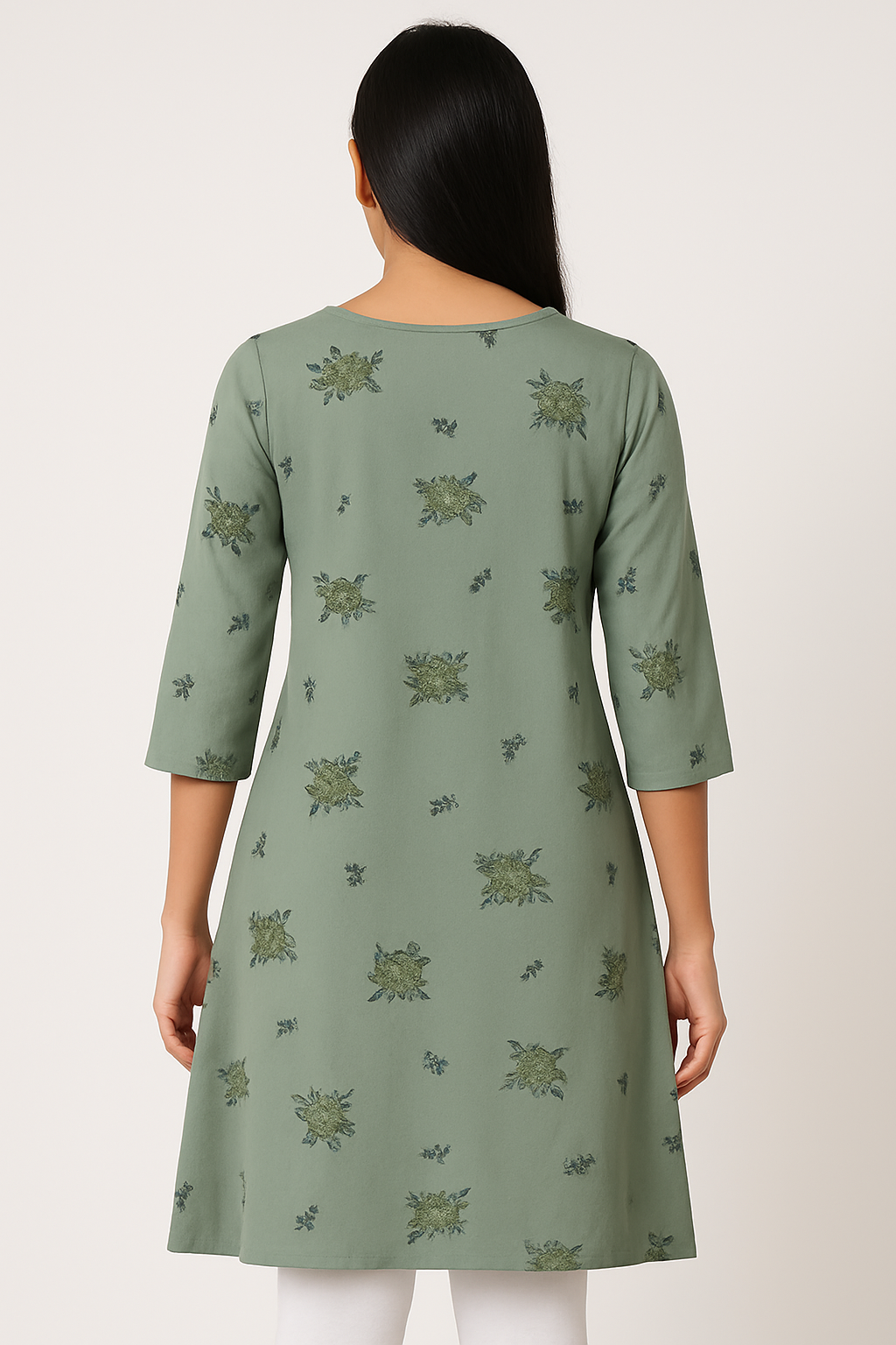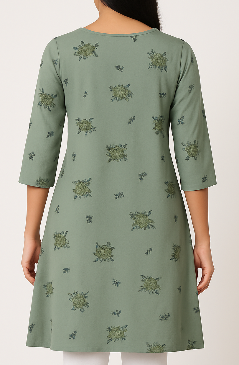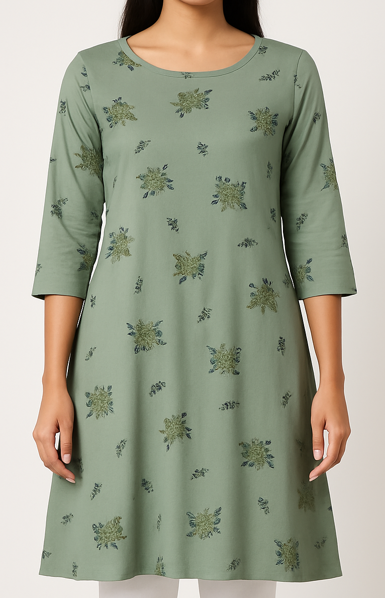 This elegant olive green A-line kurti is crafted from soft cotton fabric, offering comfort with every wear. It features an all-over floral print in subtle dark green tones, a round neckline, and 3/4th sleeves. The relaxed A-line silhouette provides a flattering fit for everyday wear. Ideal for both casual outings and office wear, pair it with leggings or palazzos for a complete look.