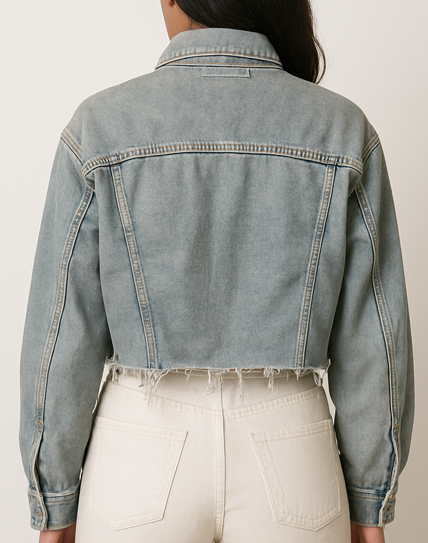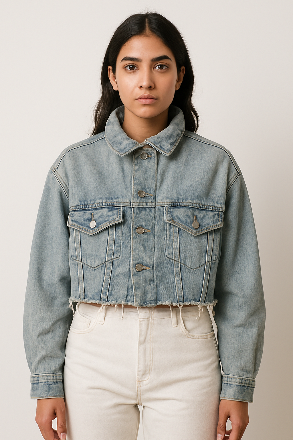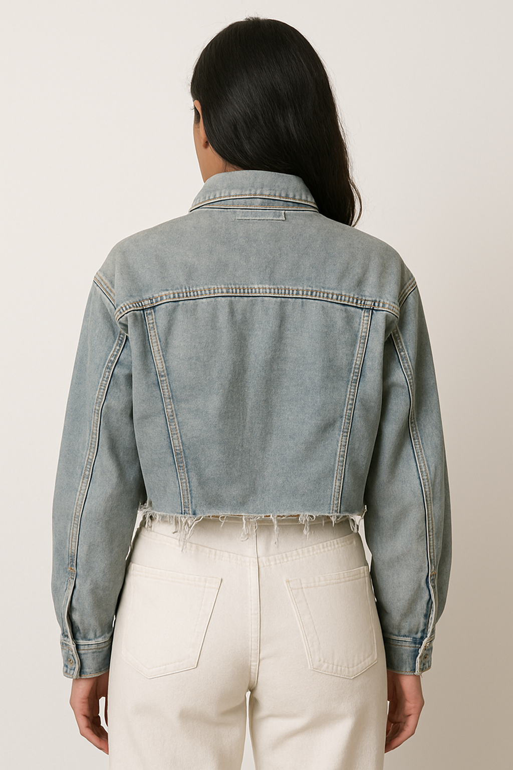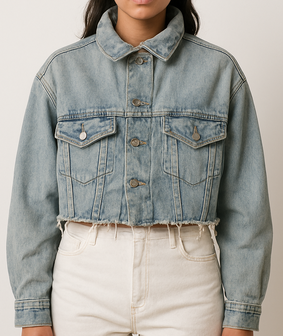 Elevate your everyday style with this raw-hem cropped denim jacket, crafted from soft faded blue denim for a modern yet vintage-inspired look. Featuring a button-down front, chest flap pockets, and full sleeves with button cuffs, it offers a stylish blend of comfort and edge. The frayed hem adds a trendy, unfinished touch, perfect for layering over casual outfits.