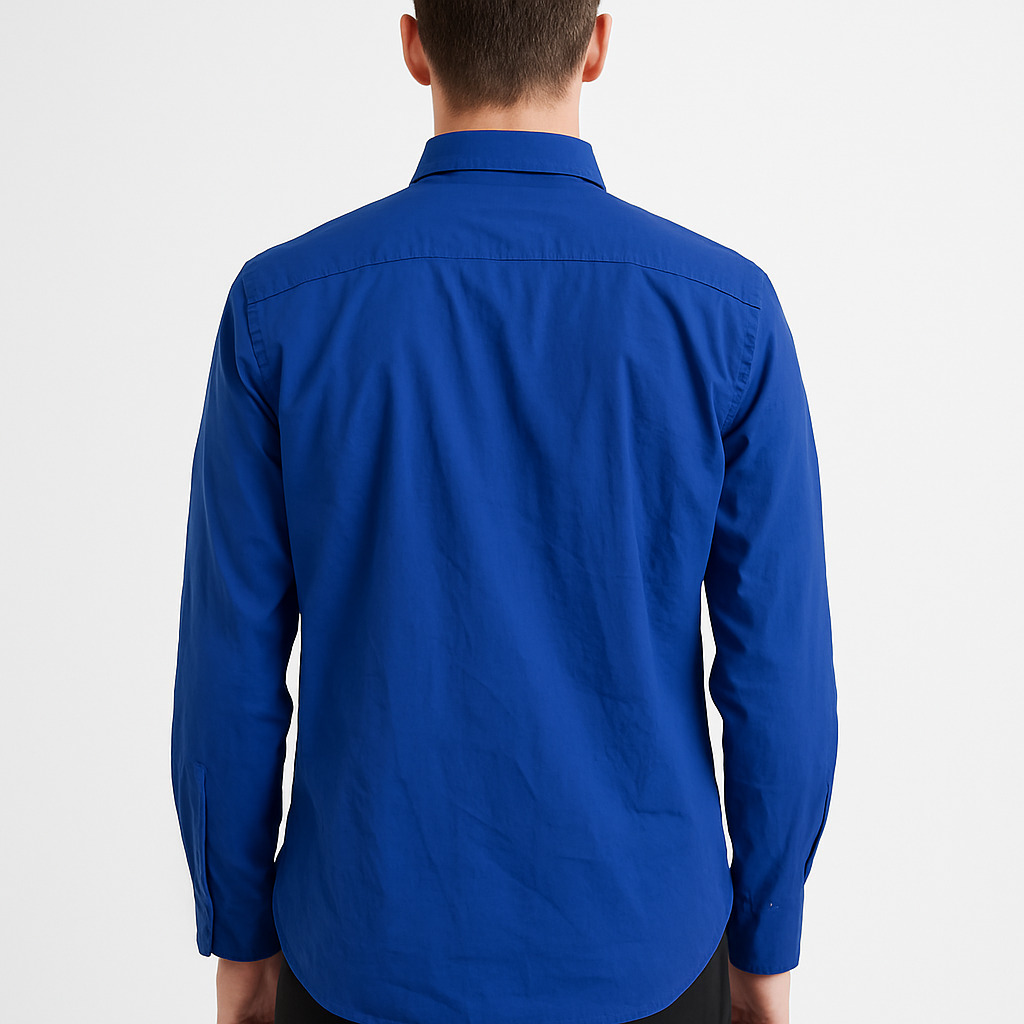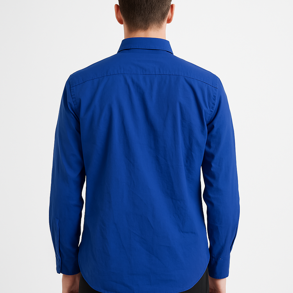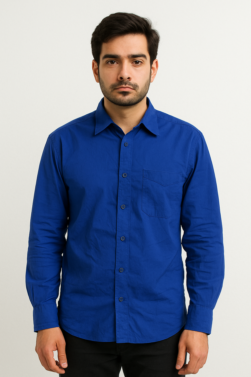 A stylish men’s full-sleeve shirt in a vibrant royal blue color, designed for both casual and semi-formal occasions. Crafted from smooth cotton fabric, it features a classic point collar, button-down placket with matching blue buttons, a single chest pocket, and standard barrel cuffs. The shirt offers a comfortable fit with precise tailoring, making it perfect for everyday wear or smart-casual outings.