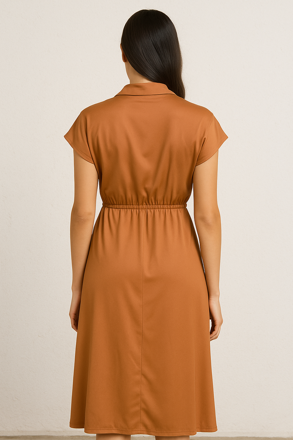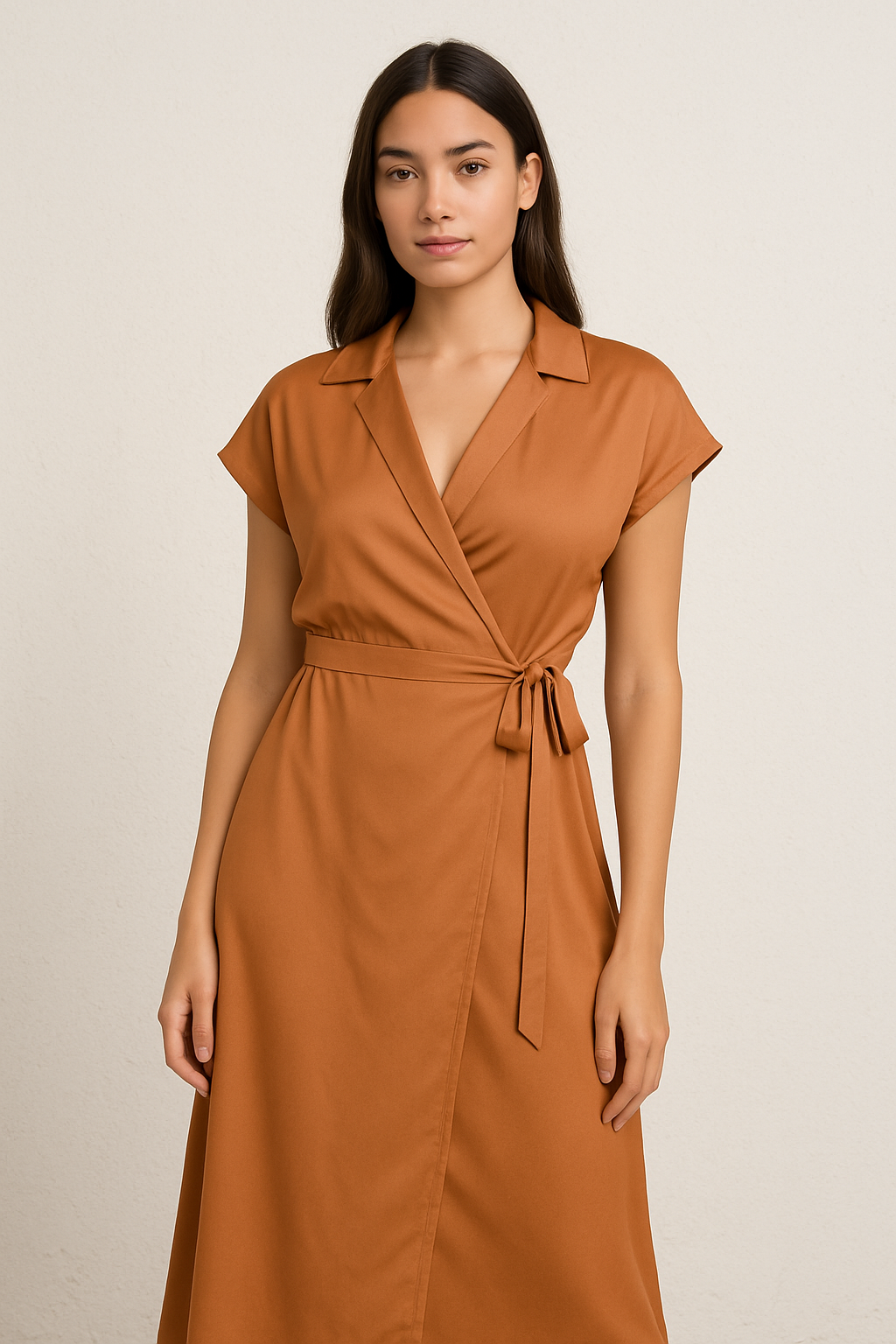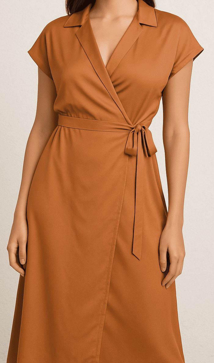 This elegant rust brown wrap midi dress features a collared neckline, short sleeves, and a flattering tie-waist detail. Designed in a flowy silhouette with an elasticated waistline at the back, it offers both comfort and a defined shape. The soft fabric and classic design make it a versatile pick for workwear, brunches, or evening outings.