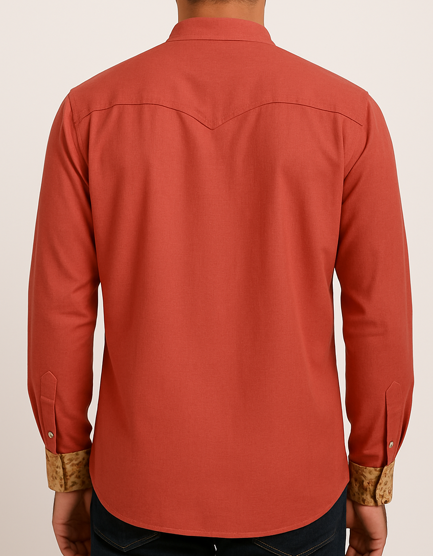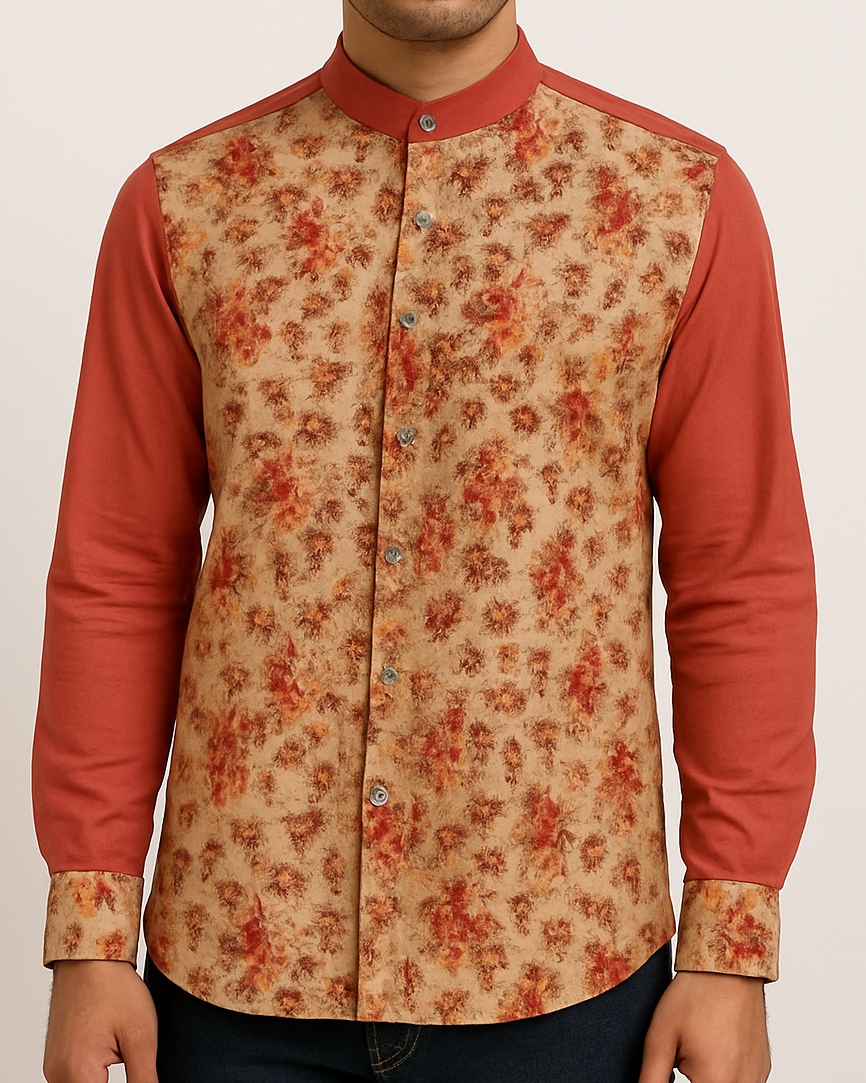 Make a statement with this stylish rust-colored full-sleeve shirt featuring a unique beige floral front panel. Designed with a sleek mandarin collar and detailed floral print, it effortlessly blends traditional charm with modern tailoring. The contrasting solid rust sleeves, collar, and back offer a balanced look. Finished with printed inner cuffs for a refined touch, this shirt is perfect for festive gatherings and smart-casual occasions.
