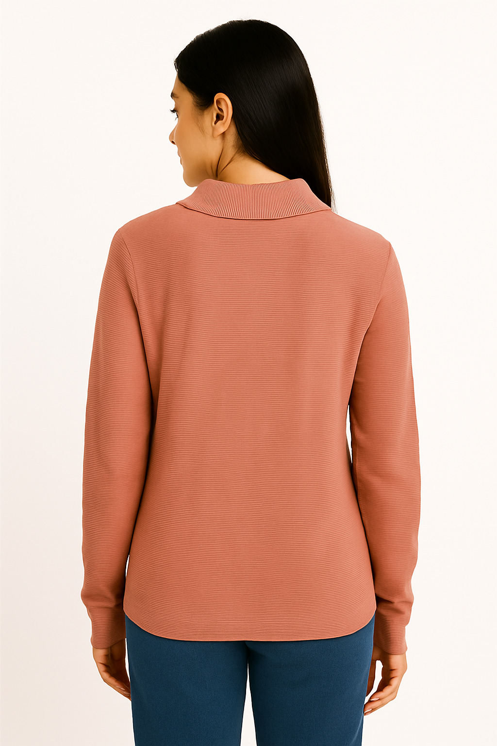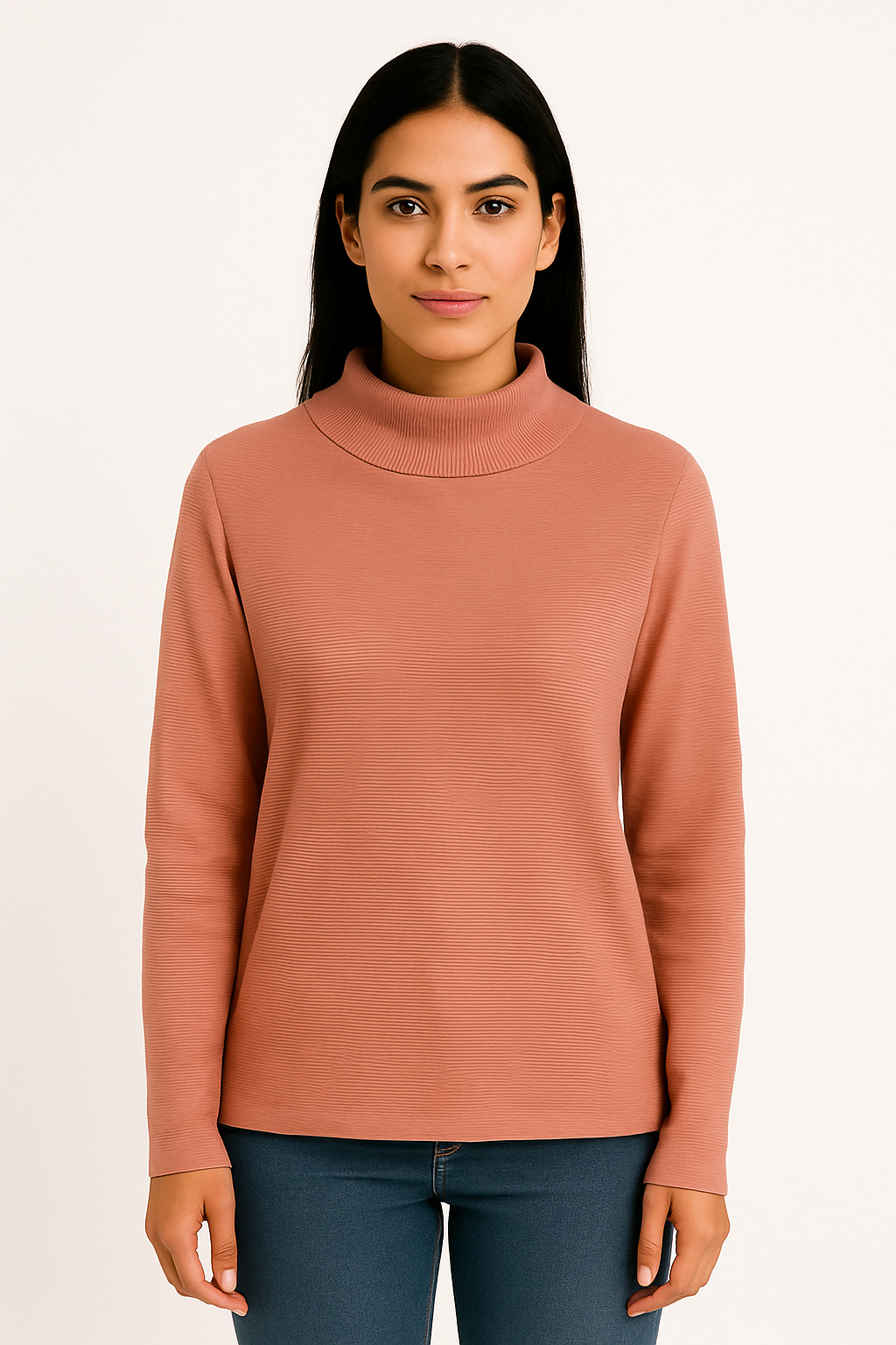 Elevate your everyday style with this women’s full-sleeve ribbed knit top in a warm rust hue. Designed with a structured mock-neck collar and a subtle ribbed texture throughout, this top combines comfort and sophistication. The soft stretch knit fabric ensures a flattering fit, while the minimal design makes it perfect for casual or semi-formal wear. Pair it with jeans, skirts, or trousers for an effortlessly chic look.