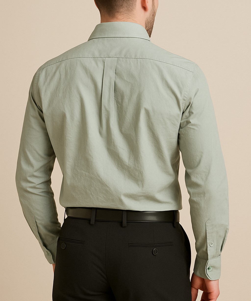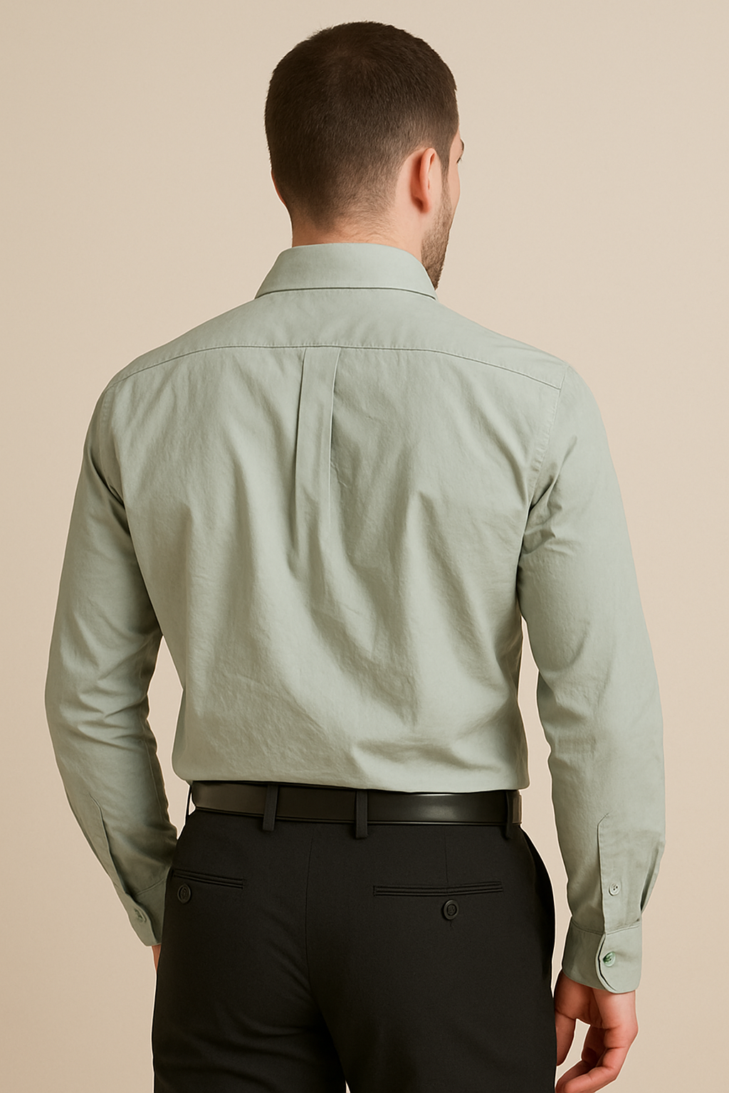 This men’s sage green formal shirt is designed for a refined, polished look, perfect for office wear or formal occasions. It features a classic point collar, a clean front placket with matching buttons, and long sleeves with single-button cuffs. Made from smooth, lightweight fabric with a subtle matte finish, it ensures both comfort and style. The back features a box pleat for ease of movement, and the fit is tailored for a sharp silhouette.