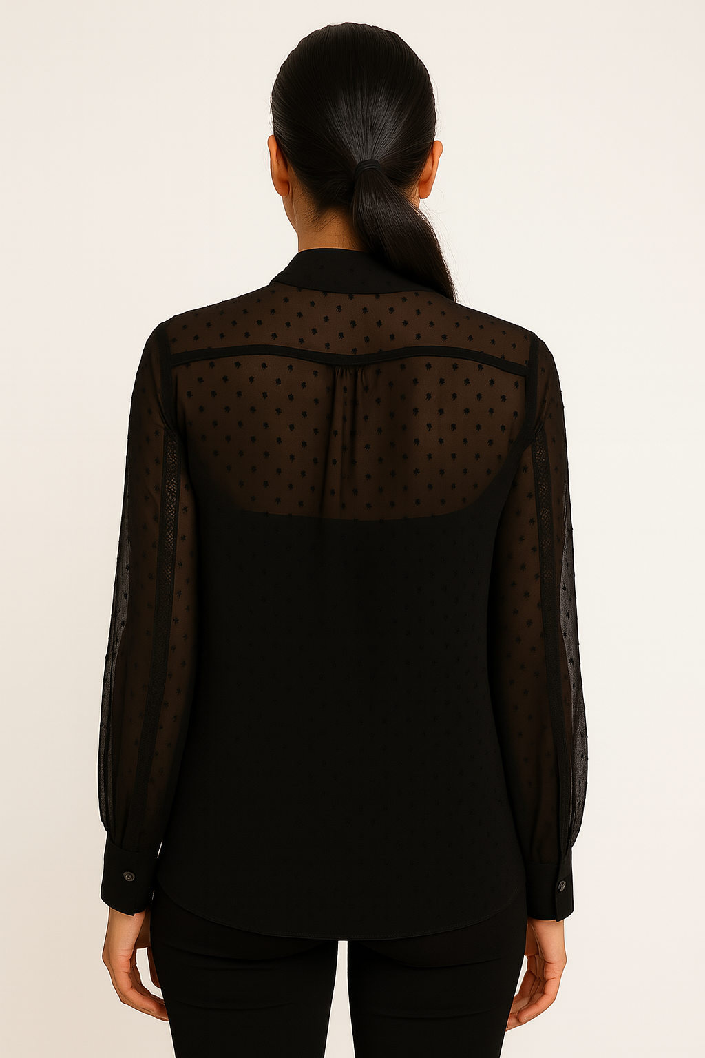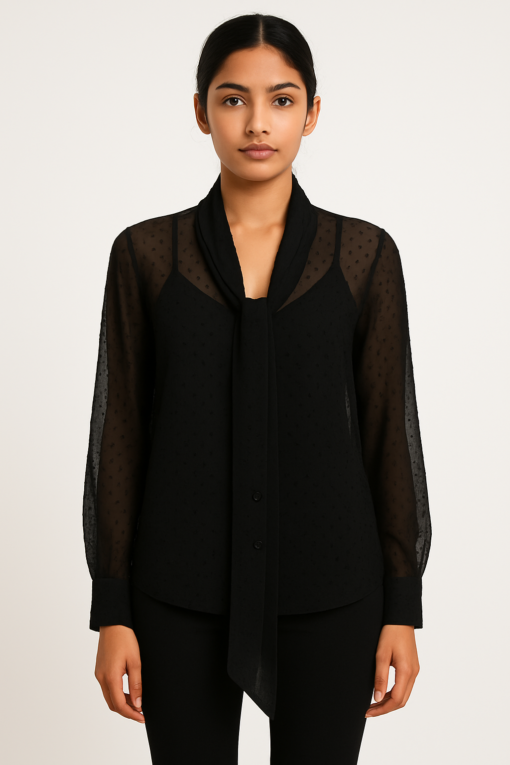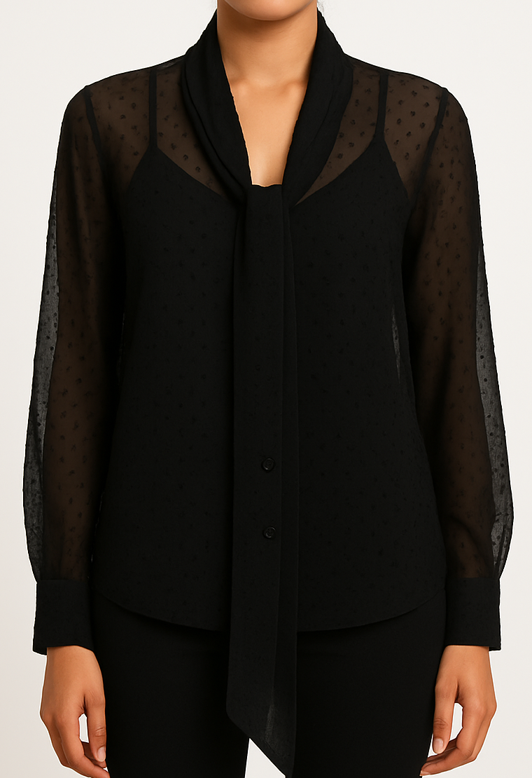 This elegant sheer black blouse blends sophistication with subtle flair. Featuring a delicate polka dot pattern over transparent chiffon sleeves and back, the blouse comes with a solid black inner lining and a stylish tie-neck design. The full sleeves have cuffed ends with button closures for a polished finish. Perfect for formal evenings, office wear, or stylish occasions, this blouse pairs seamlessly with trousers or skirts for a chic silhouette.