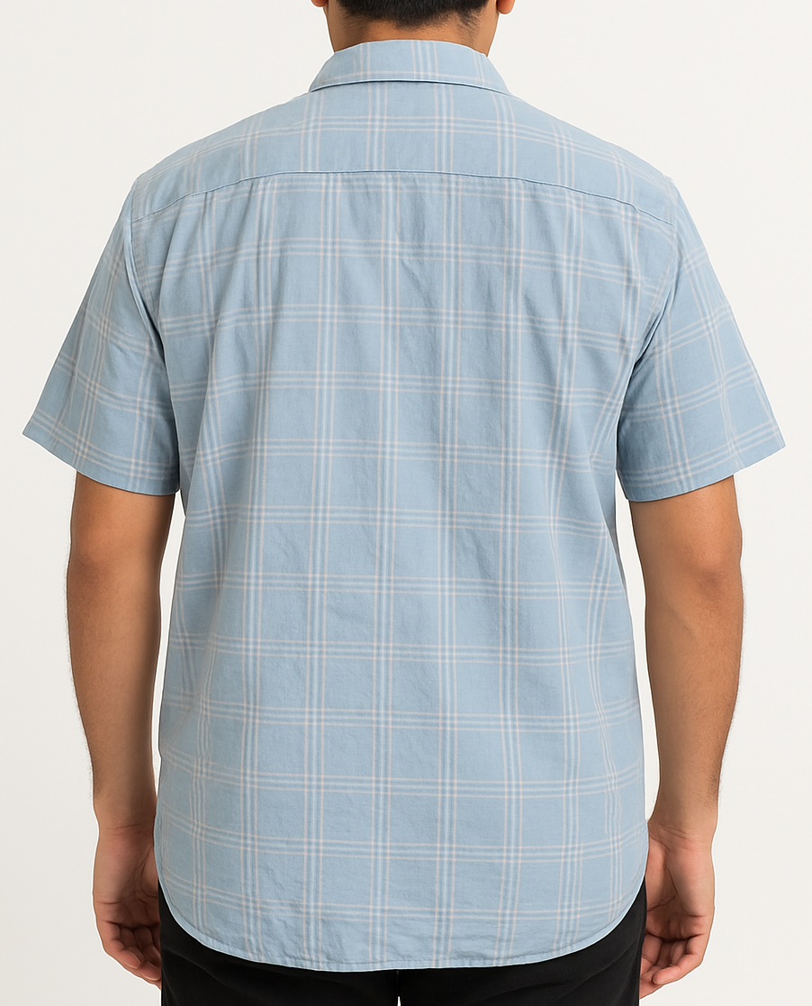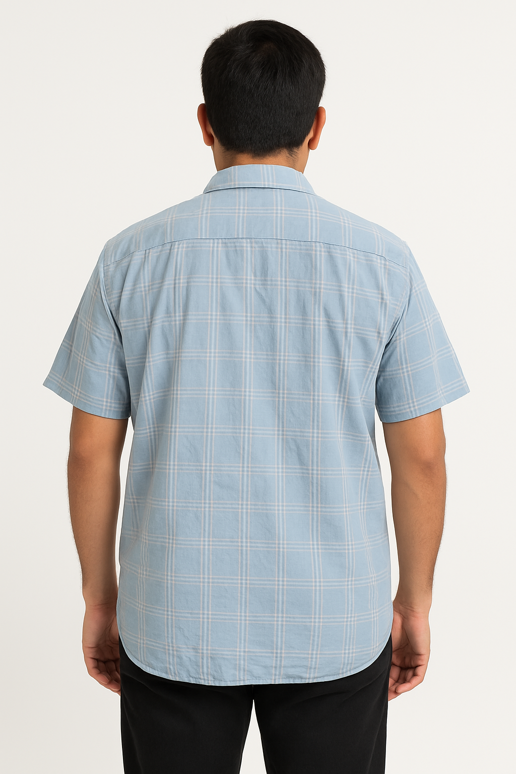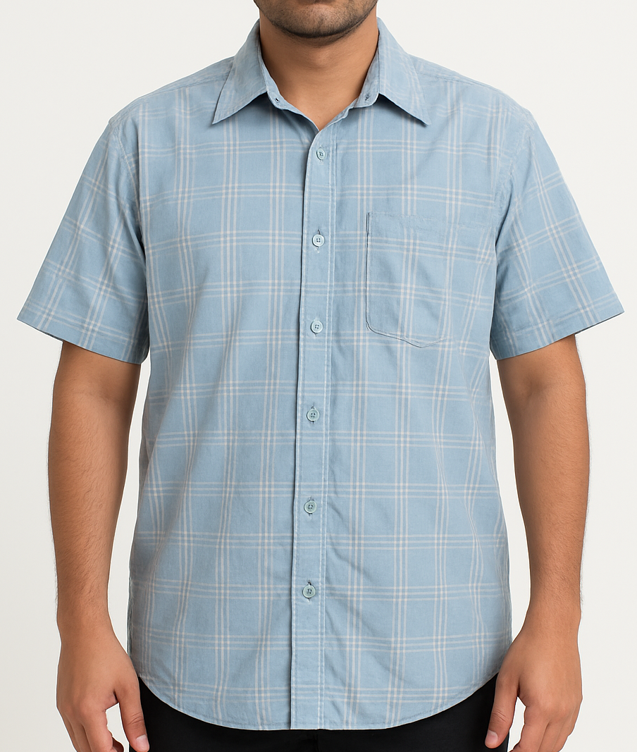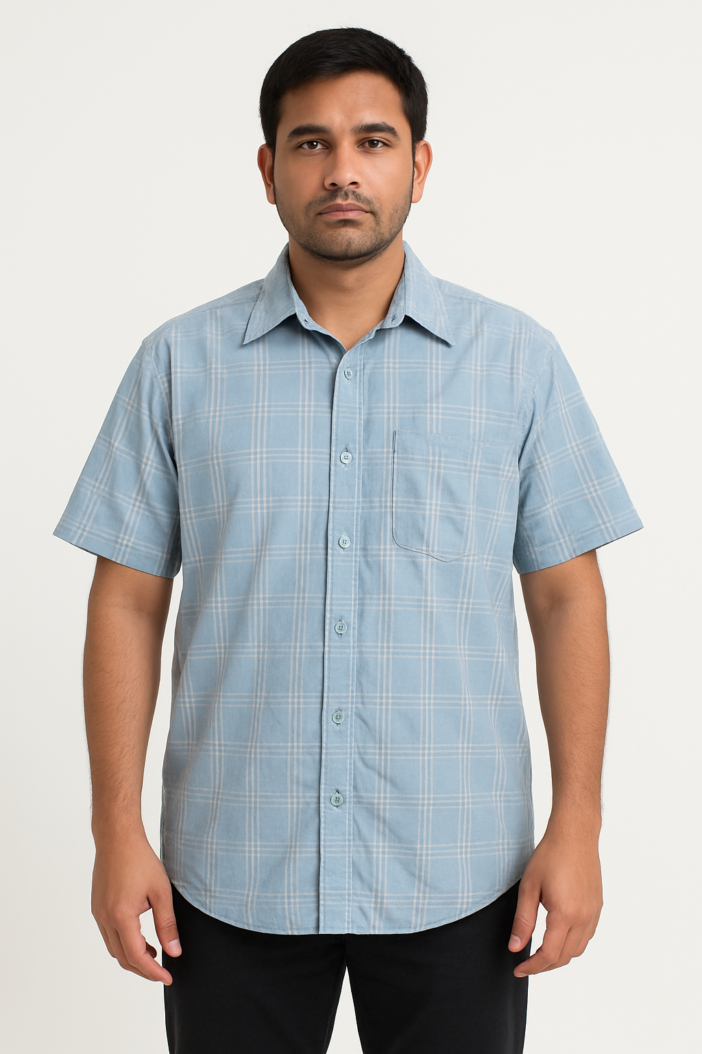 Upgrade your casual wardrobe with this refreshing sky blue checked shirt. Made from soft cotton fabric, it features a smart grid pattern with short sleeves and a relaxed fit. The shirt includes a classic spread collar, button-front closure, and a single chest pocket, offering both comfort and style. Ideal for warm weather, casual outings, or semi-formal occasions.