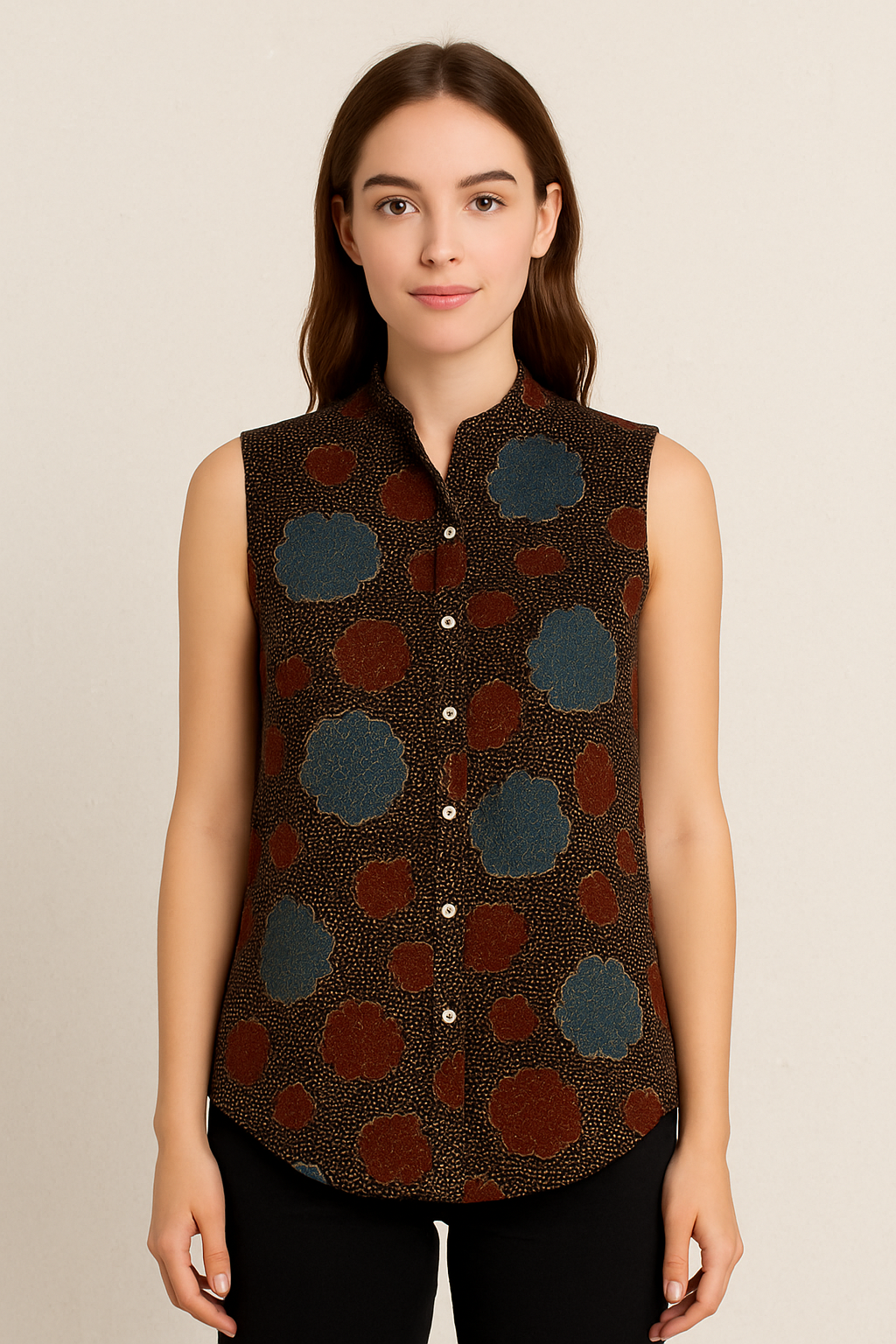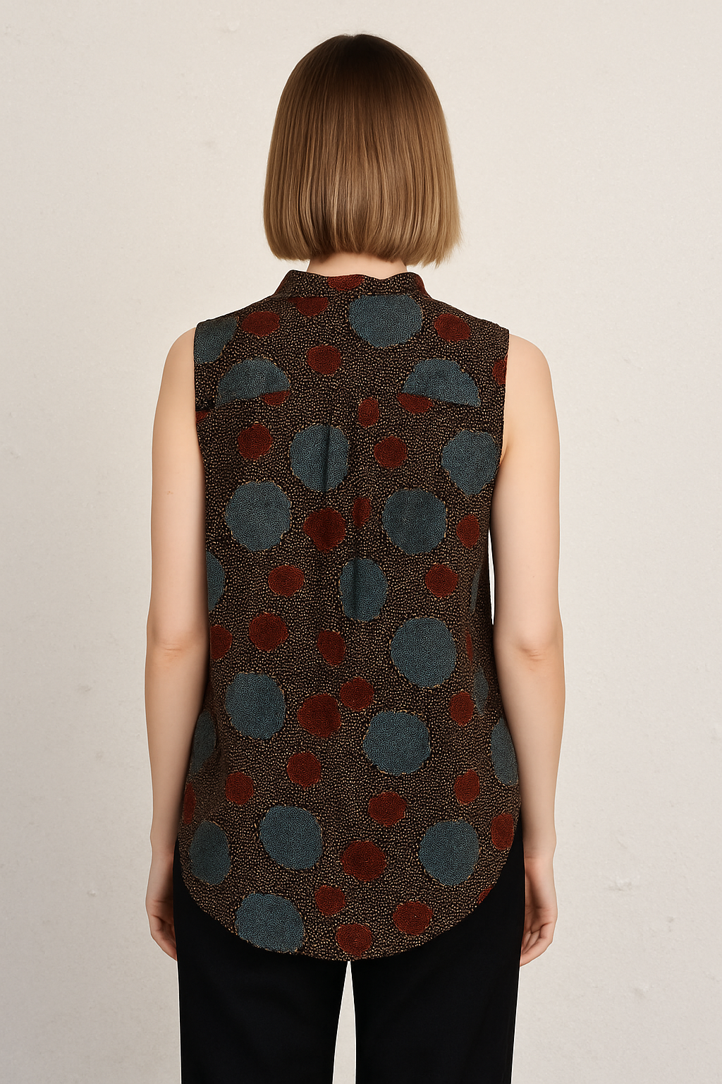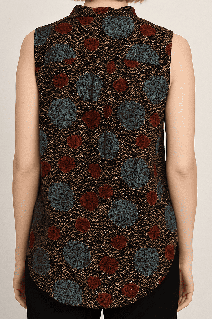 This eye-catching sleeveless shirt features a playful mix of oversized and small abstract polka dots in muted blue and maroon tones over a textured brown background. The front button-down style and mandarin collar provide a polished silhouette, while the curved hemline and soft fabric ensure comfort. Ideal for casual daywear or layering under jackets, this top adds artistic flair to your wardrobe.