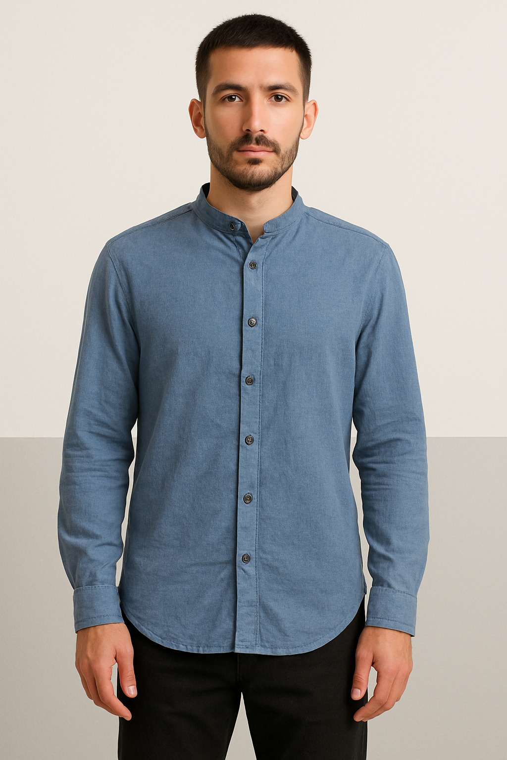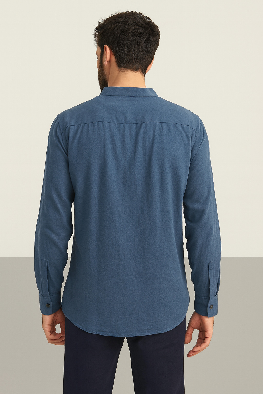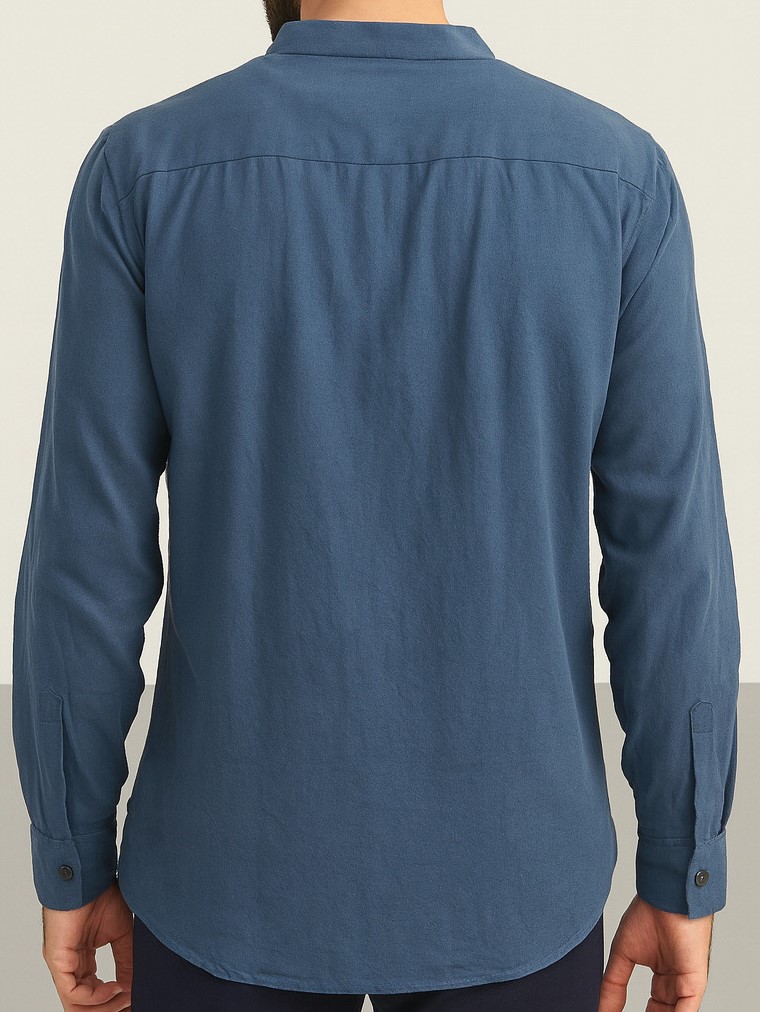 This men’s full-sleeve shirt features a sleek mandarin collar and a clean, button-down front design, offering a modern yet versatile look. Crafted from a soft, breathable cotton fabric in a stylish steel blue shade, it provides all-day comfort while maintaining a polished appearance. The shirt includes a slightly curved hemline for easy tucking or untucked styling, buttoned cuffs, and precise stitching for added durability. Ideal for casual outings, office wear, or semi-formal occasions.