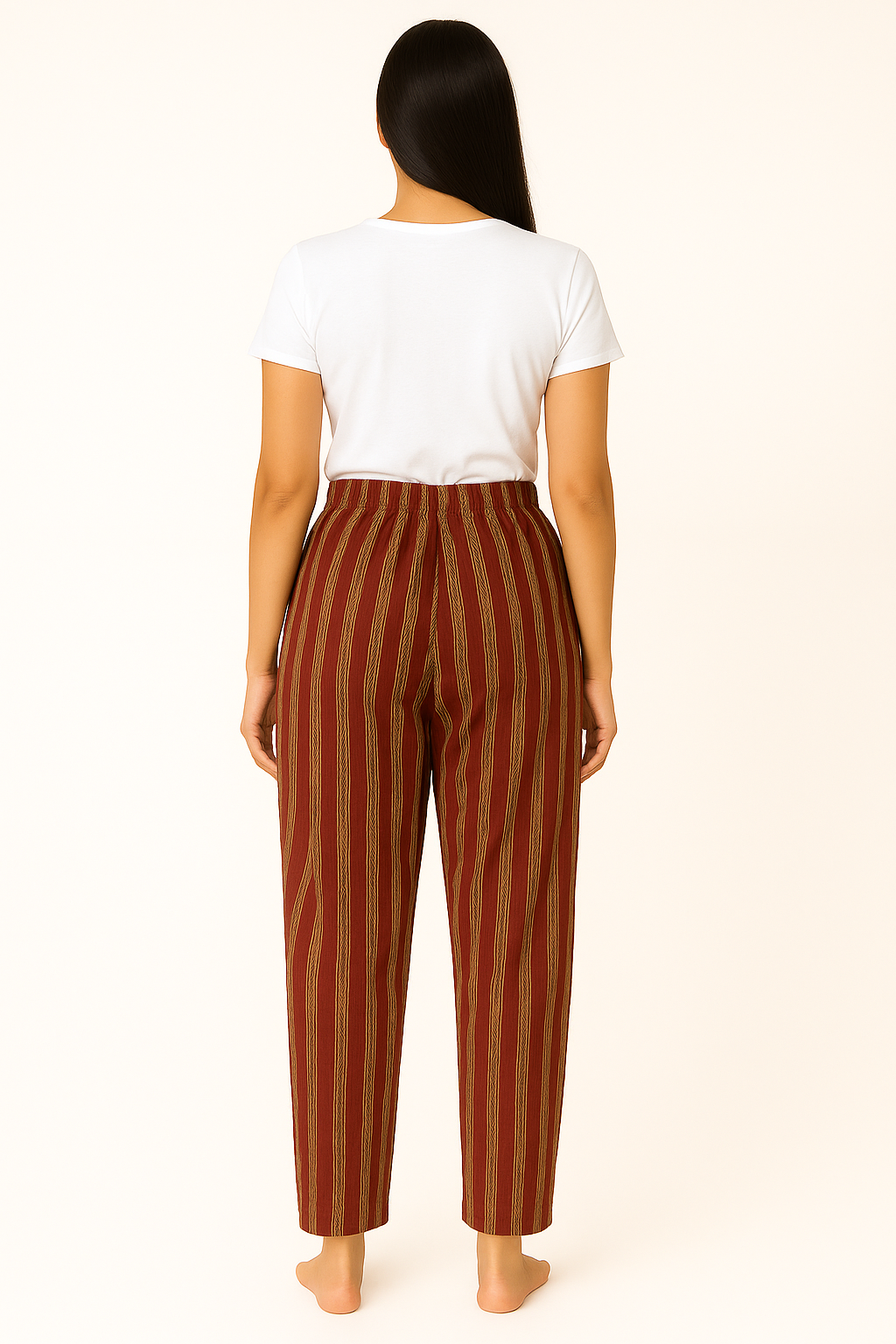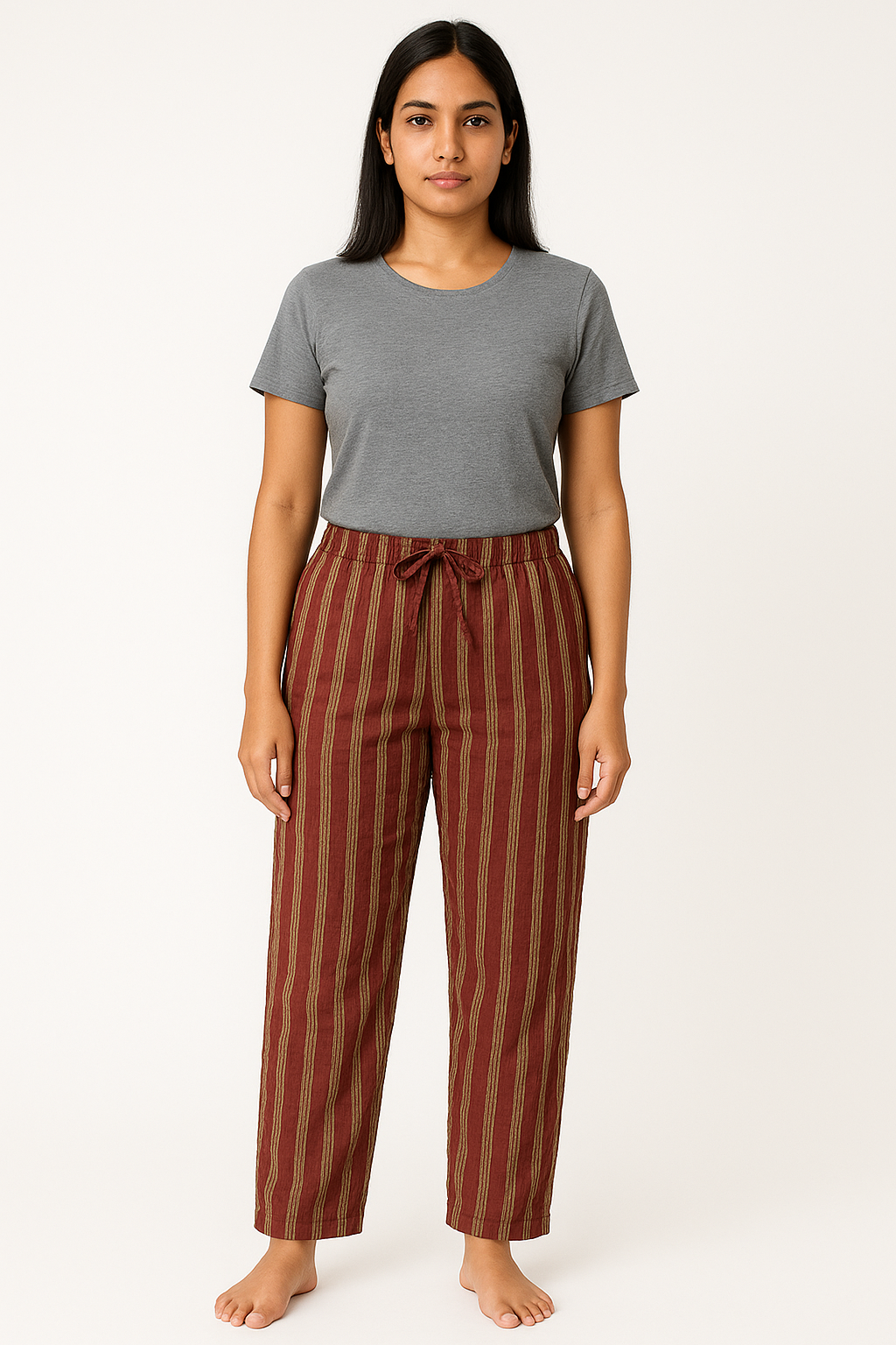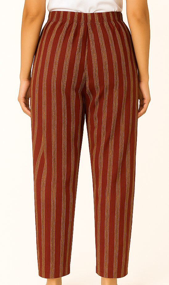 These women’s cotton straight-fit pants are designed for all-day comfort with a relaxed silhouette and breathable fabric. Featuring a deep maroon base with mustard vertical stripes, they create a flattering elongated look. The elasticated waistband with a front drawstring tie ensures a secure and adjustable fit, while the full-length cut makes them versatile for casual outings, lounging, or pairing with kurtas and tops. Lightweight and airy, these pants are perfect for both everyday wear and seasonal styling.