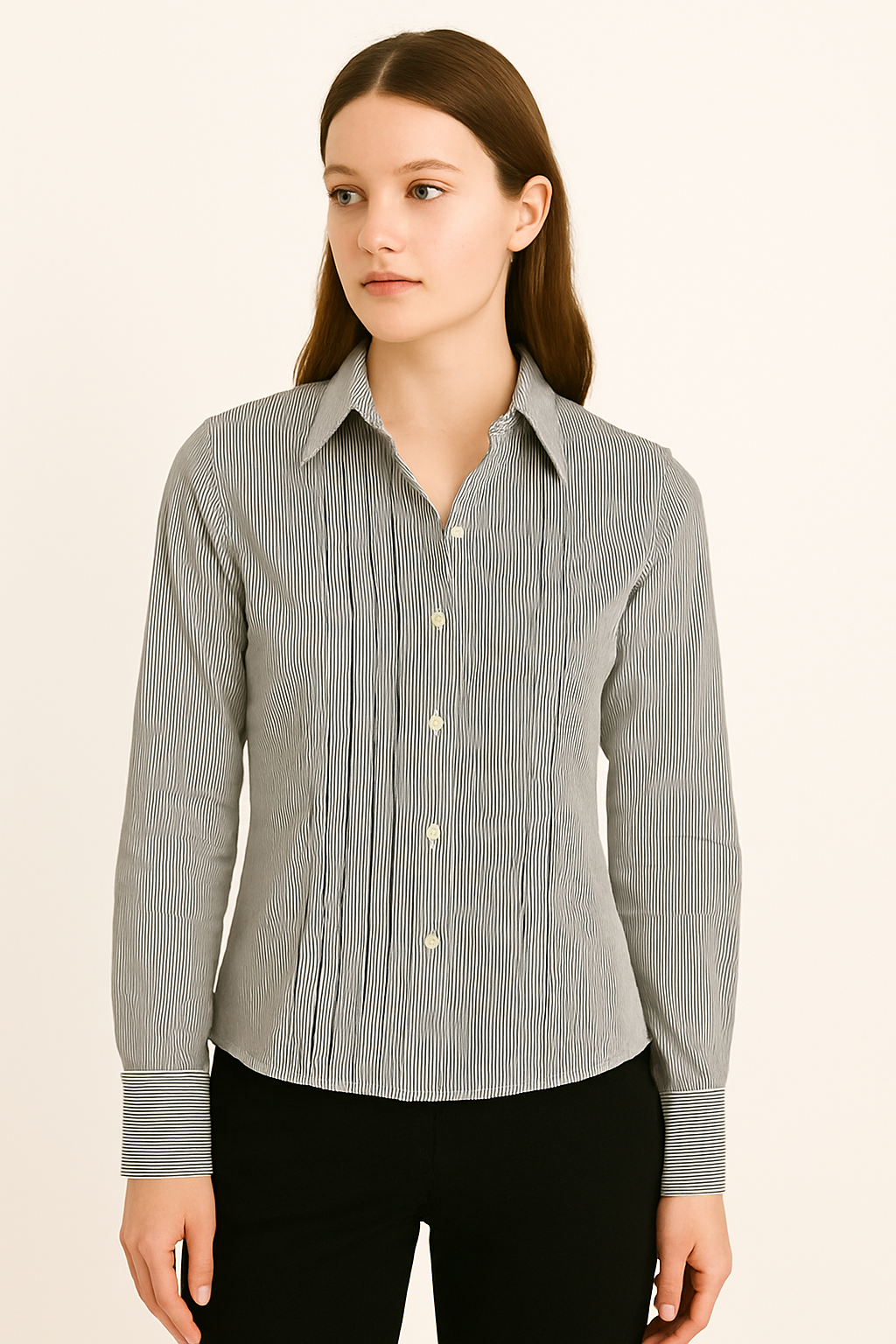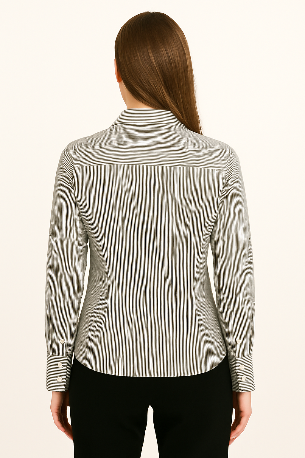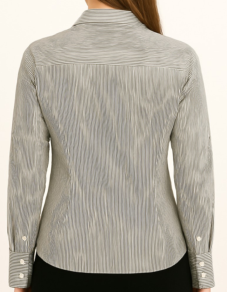 This black and white vertically striped formal shirt for women is crafted from soft, breathable cotton fabric, designed to give a tailored yet comfortable fit. It features a classic spread collar, full button placket with cream buttons, and long sleeves with contrast horizontal-striped cuffs and double-button closure. The rear design includes a horizontally striped yoke for subtle detail. Perfect for office wear or smart casual settings, it adds elegance with its sleek and structured look.