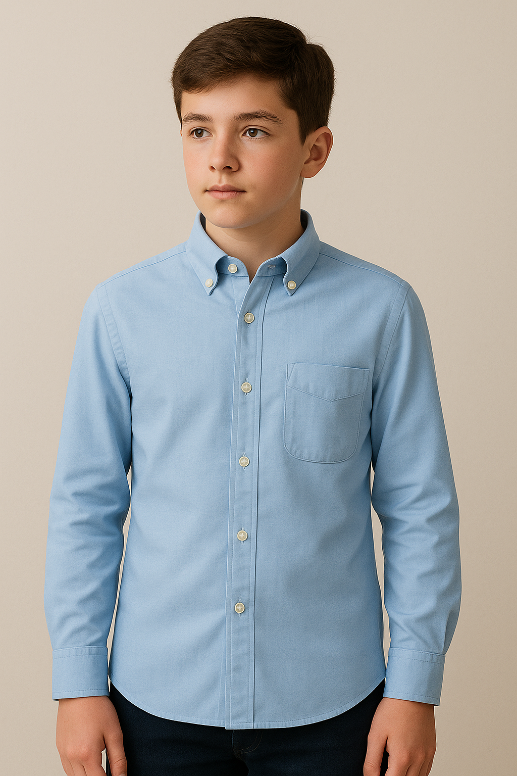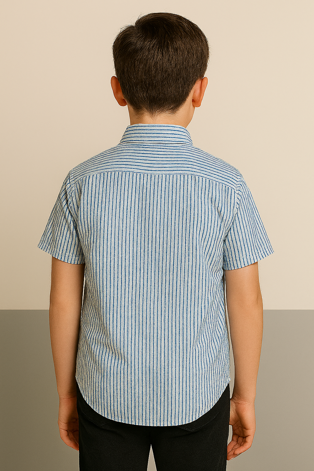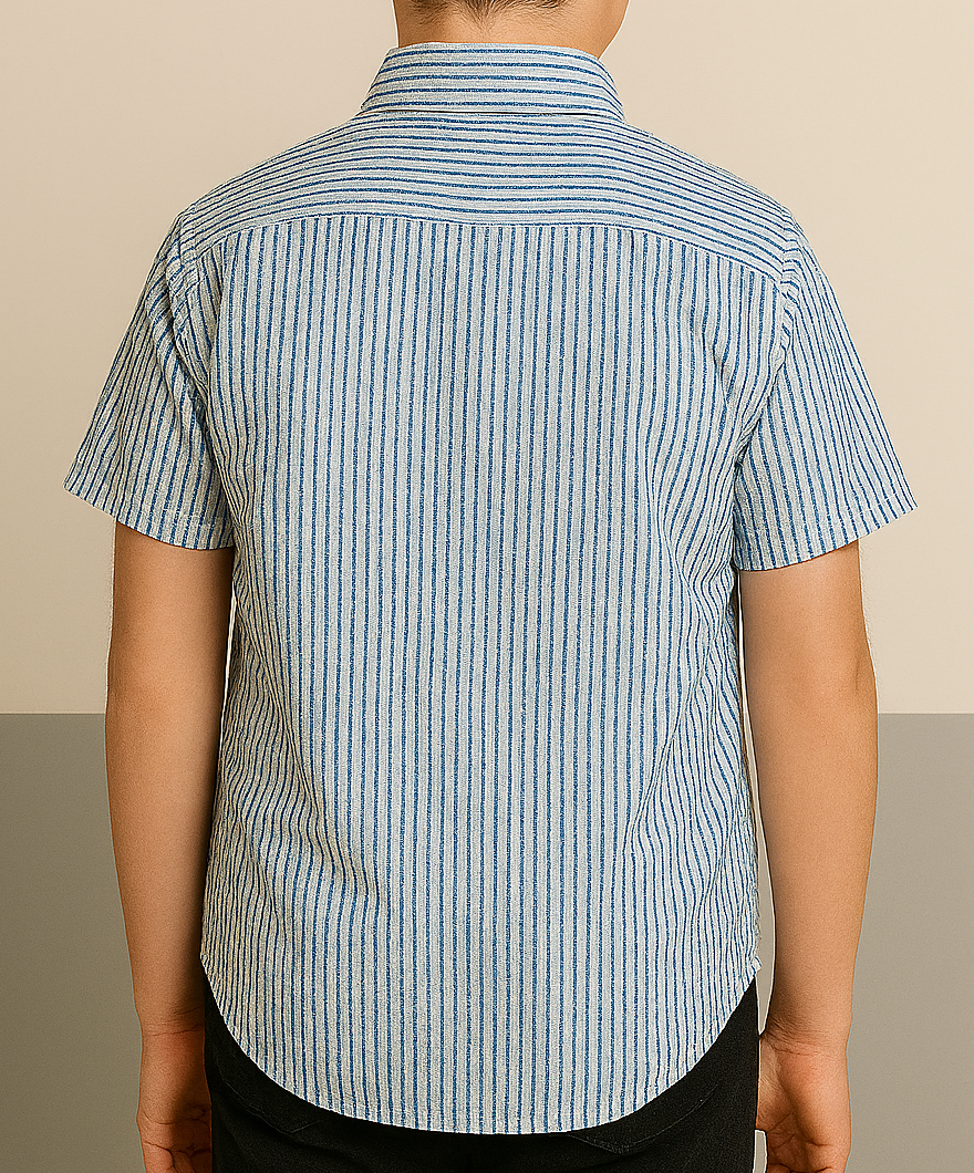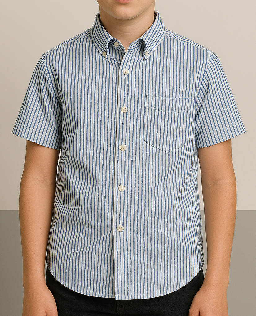 This boys’ button-up shirt is tailored from a breathable cotton fabric featuring vertical blue and white stripes. Designed with short sleeves and a smart button-down collar, it includes a front chest pocket with a subtle curved finish. The shirt delivers a polished look, perfect for casual or semi-formal occasions. A curved hem enhances its neat fit whether tucked in or left out. Shown here on a model for accurate fit representation.
