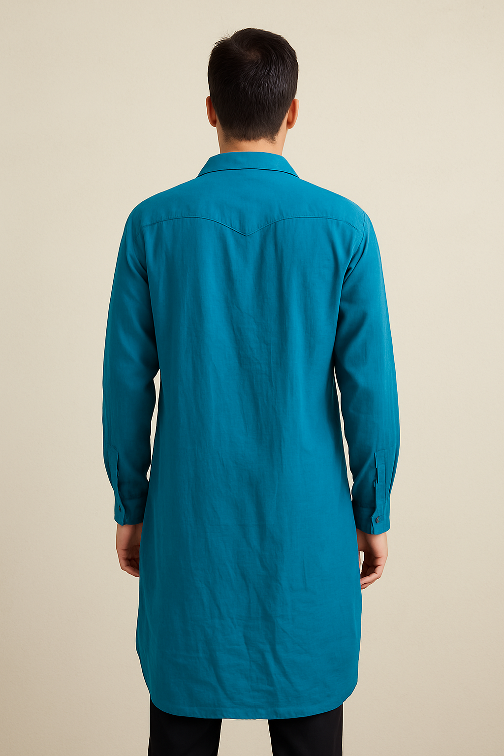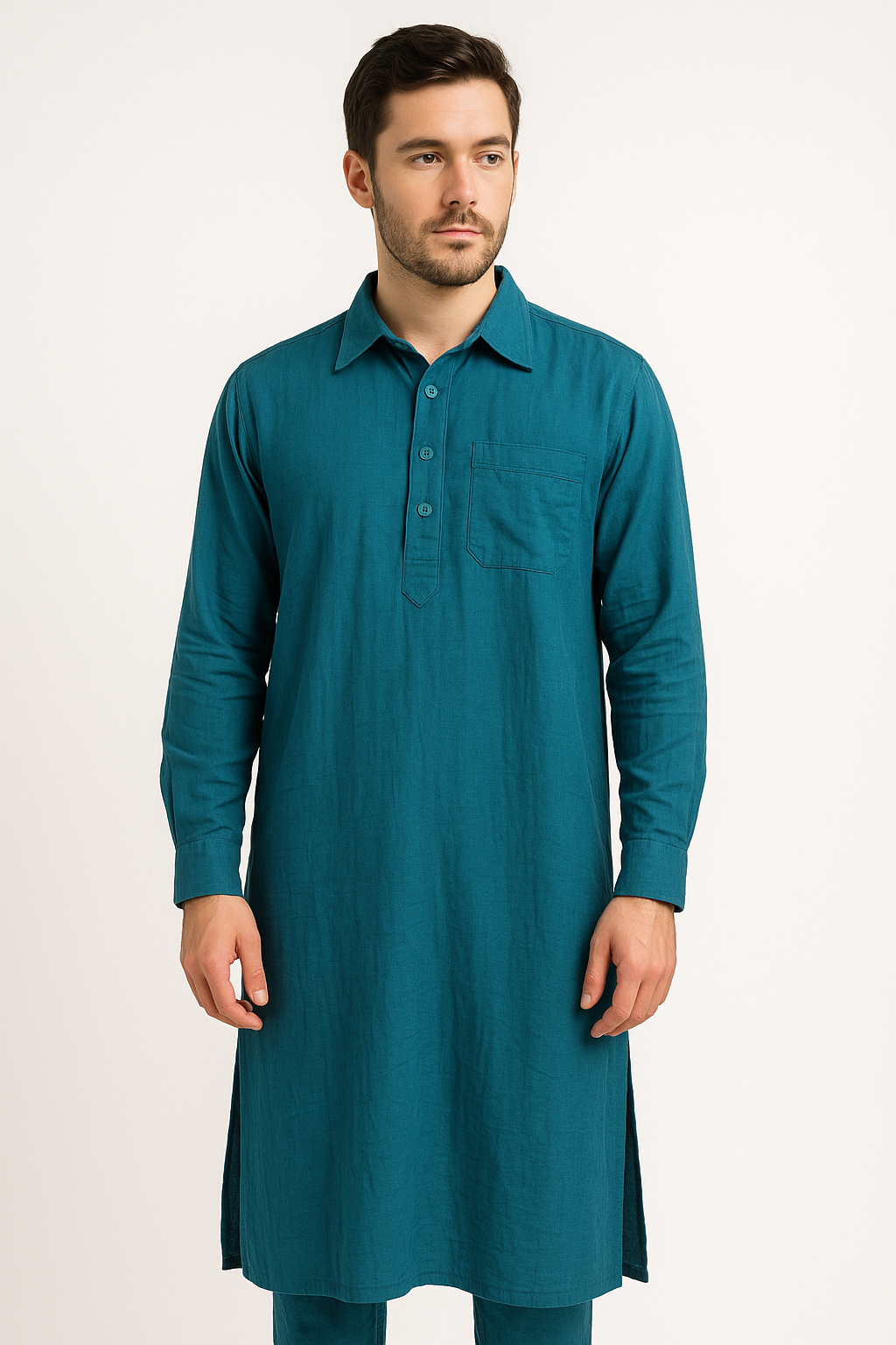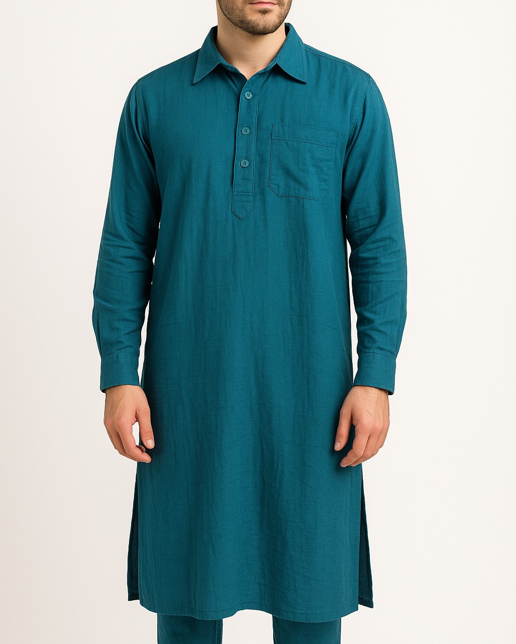Elevate your traditional wardrobe with this classic teal blue long kurta made from soft, breathable cotton. Featuring a shirt-style spread collar, four-button front placket, and a practical chest pocket, this kurta combines ethnic elegance with modern appeal. The straight-cut silhouette, full-length sleeves with buttoned cuffs, and rounded hem with side slits offer both comfort and style. Perfect for festive gatherings, casual occasions, or everyday ethnic wear.