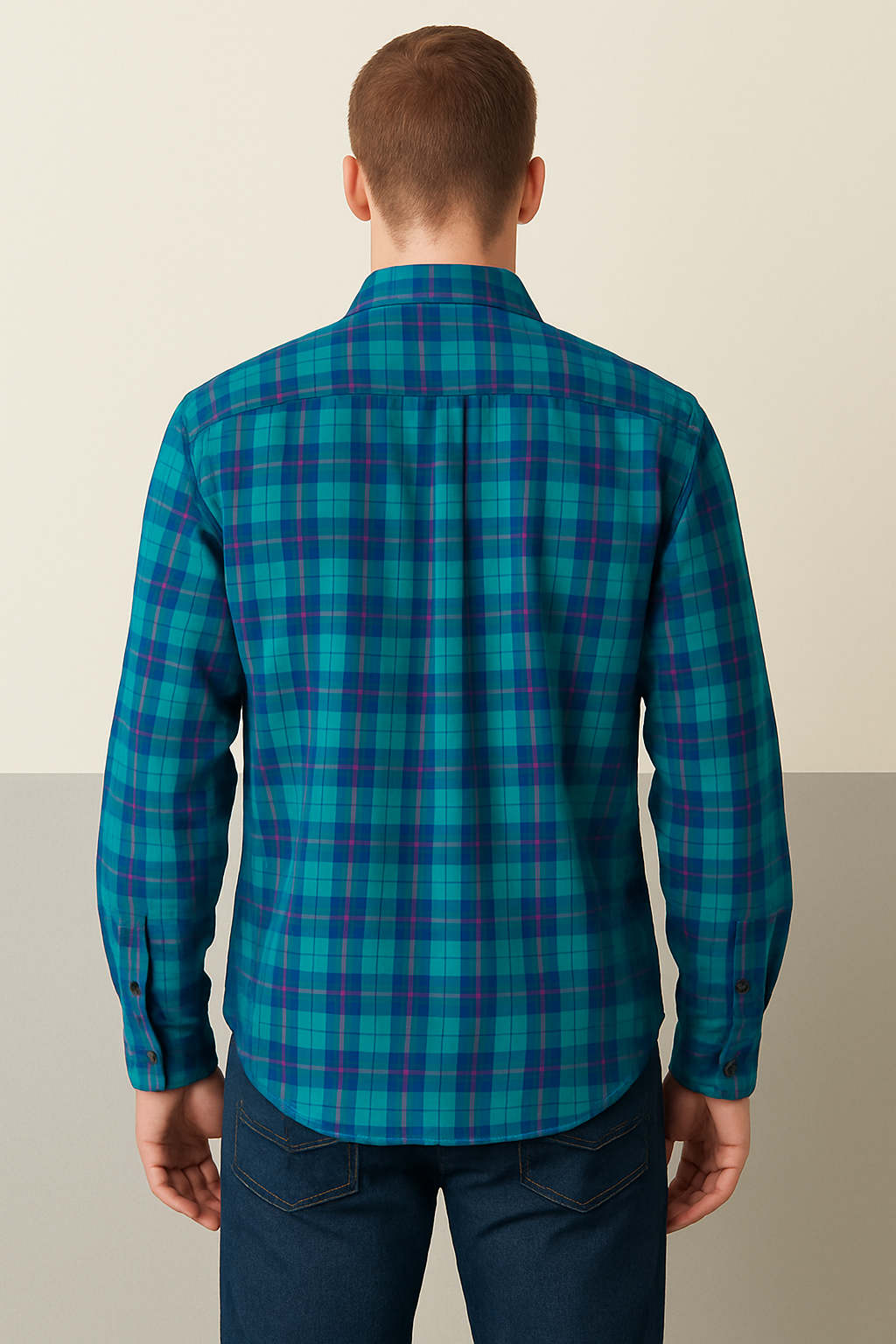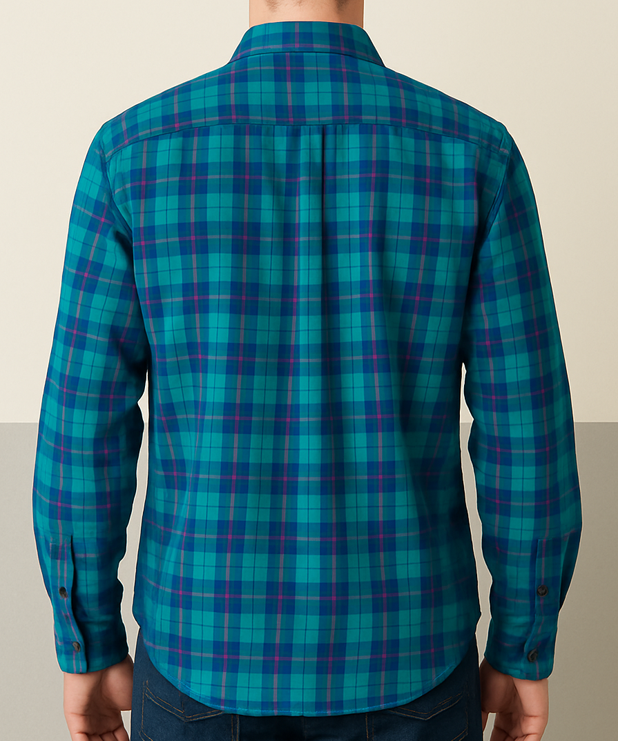 A stylish and comfortable men’s shirt crafted from soft, breathable fabric in a vibrant teal base featuring navy blue and purple checks. Designed with a classic spread collar, full button-down front, and long sleeves with buttoned cuffs, this shirt offers a perfect blend of casual and semi-formal appeal. The shirt is tailored for a regular fit with a straight hem and no chest pocket, making it ideal for layering or standalone wear.