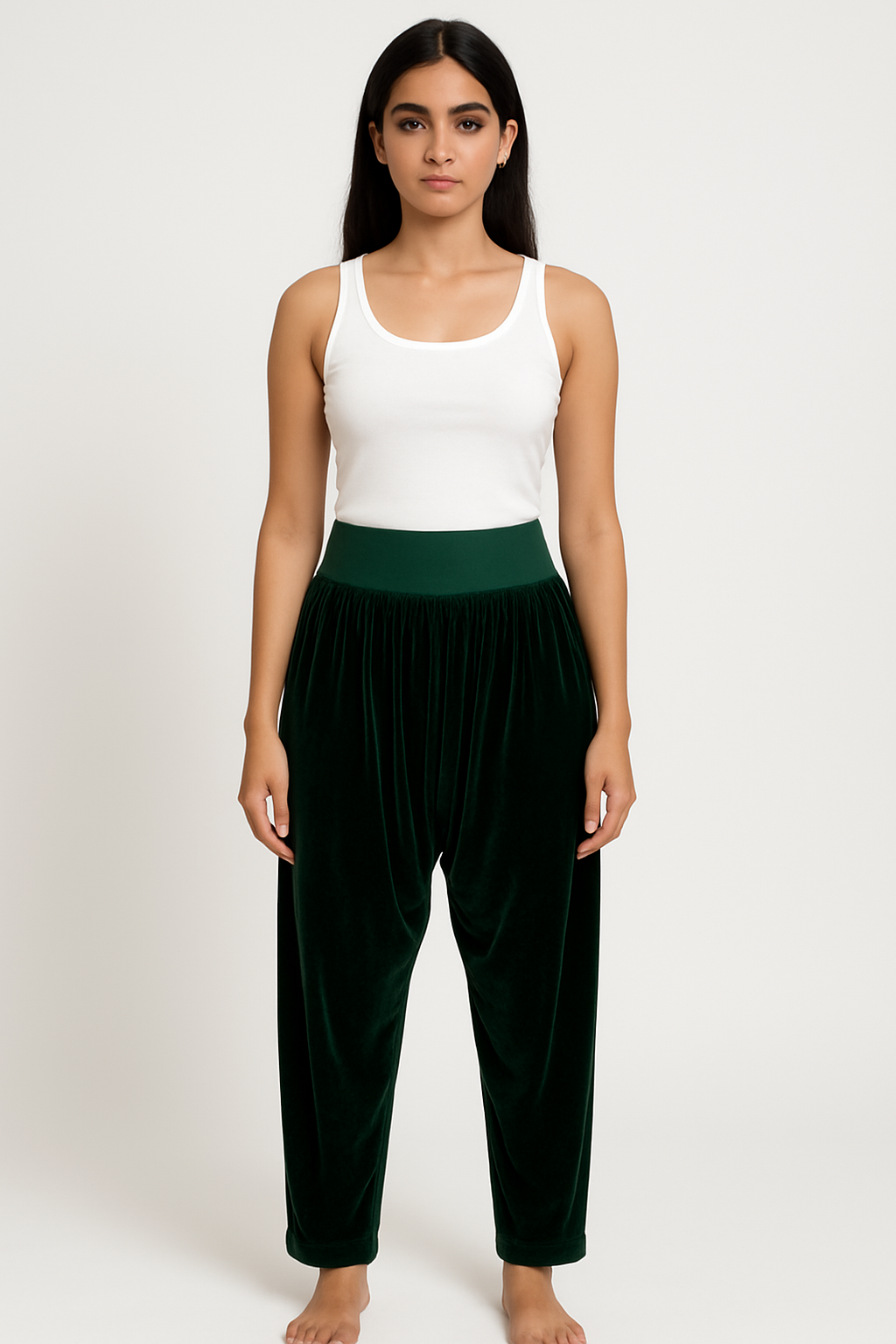 Indulge in luxurious comfort with these emerald green velvet harem pants, designed for both elegance and ease. Crafted from plush velvet fabric, these pants feature a broad high-rise waistband that offers a secure yet flexible fit. The relaxed, draped silhouette tapers gently at the ankle for a modern, flowy finish. Ideal for lounging or styling with statement tops, these pants fuse comfort with a touch of regal glam.