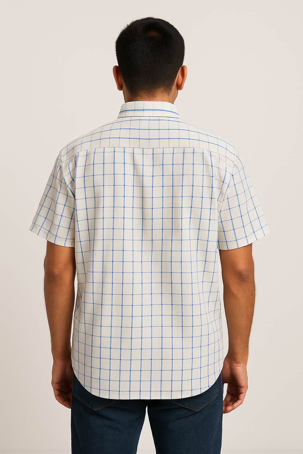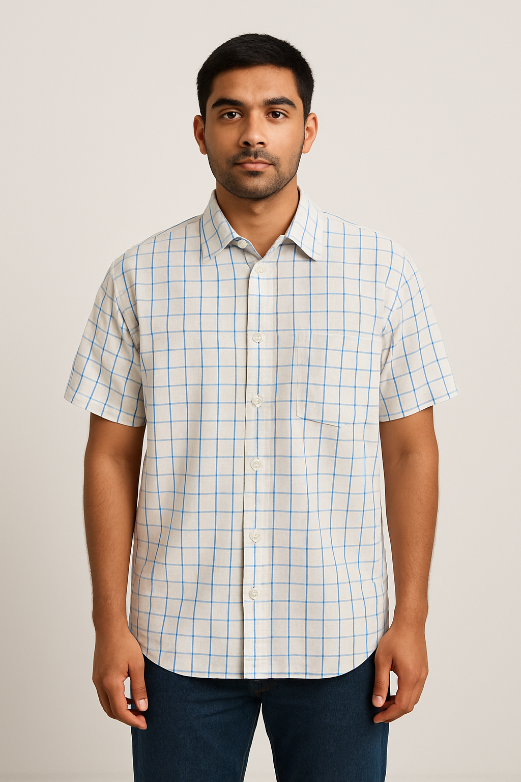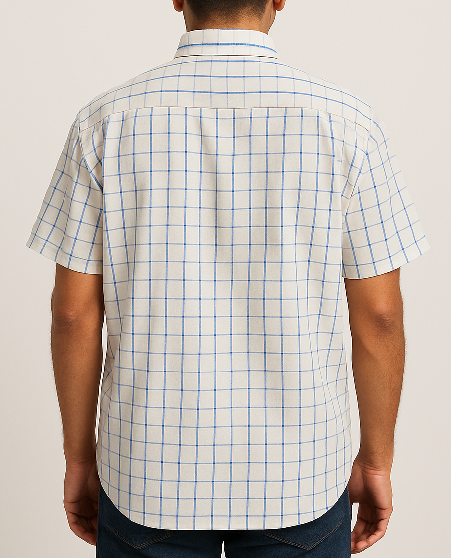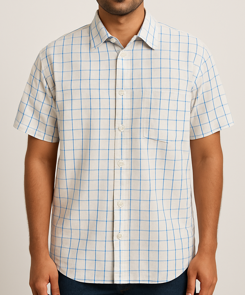 Elevate your casual wardrobe with this classic white cotton shirt featuring a smart blue grid check pattern. Designed with short sleeves, a crisp collar, and a front button placket, it offers a clean yet stylish look. The shirt includes a single chest pocket for added utility and is tailored in a comfortable straight fit that sits well on the body. Perfect for both casual Fridays and weekend brunches.