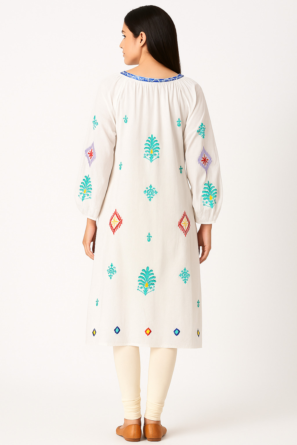 This white embroidered kurta radiates boho-chic charm with its vibrant multicolored thread motifs and relaxed silhouette. The round neckline is accented with intricate blue embroidery and finished with a tasseled tie-up front for a feminine touch. Crafted from soft, breathable fabric, this kurta features long gathered sleeves and a straight hemline. Ideal for festive gatherings or everyday ethnic wear, its rich embroidery in turquoise, red, yellow, and purple makes it a standout piece.