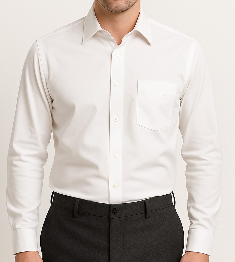 This men’s classic white formal shirt is tailored for a sharp, professional appearance. Crafted from smooth, breathable fabric, it features a crisp spread collar, full sleeves with buttoned barrel cuffs, and a neatly stitched front placket with matching white buttons. The left chest pocket adds both utility and style. Its clean design makes it versatile for office wear, business meetings, or formal occasions. The shirt offers a comfortable fit with precise measurements for a structured yet relaxed feel.