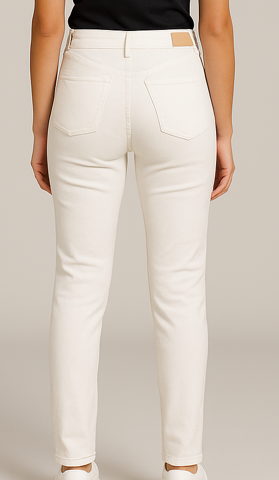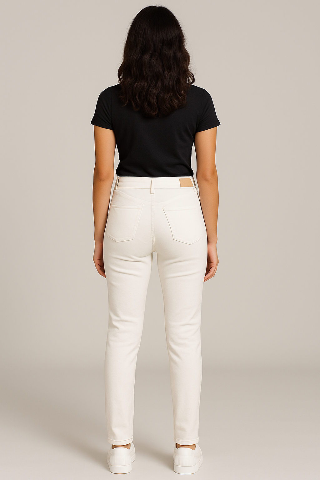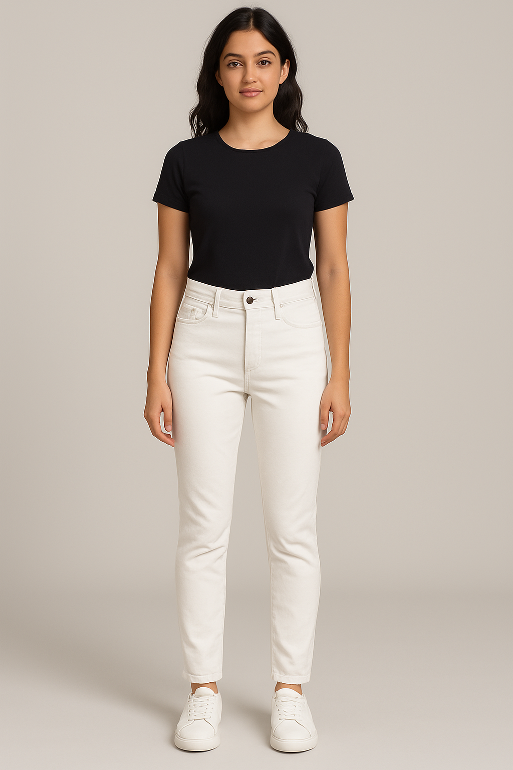 Elevate your everyday style with these women’s high-rise slim-fit jeans in crisp white. Crafted from a premium stretch cotton blend, these jeans offer a flattering silhouette with a snug waist and a tapered ankle-length finish. Designed with a classic five-pocket construction, button closure, and belt loops, they pair perfectly with casual tees or smart tops for versatile wear.