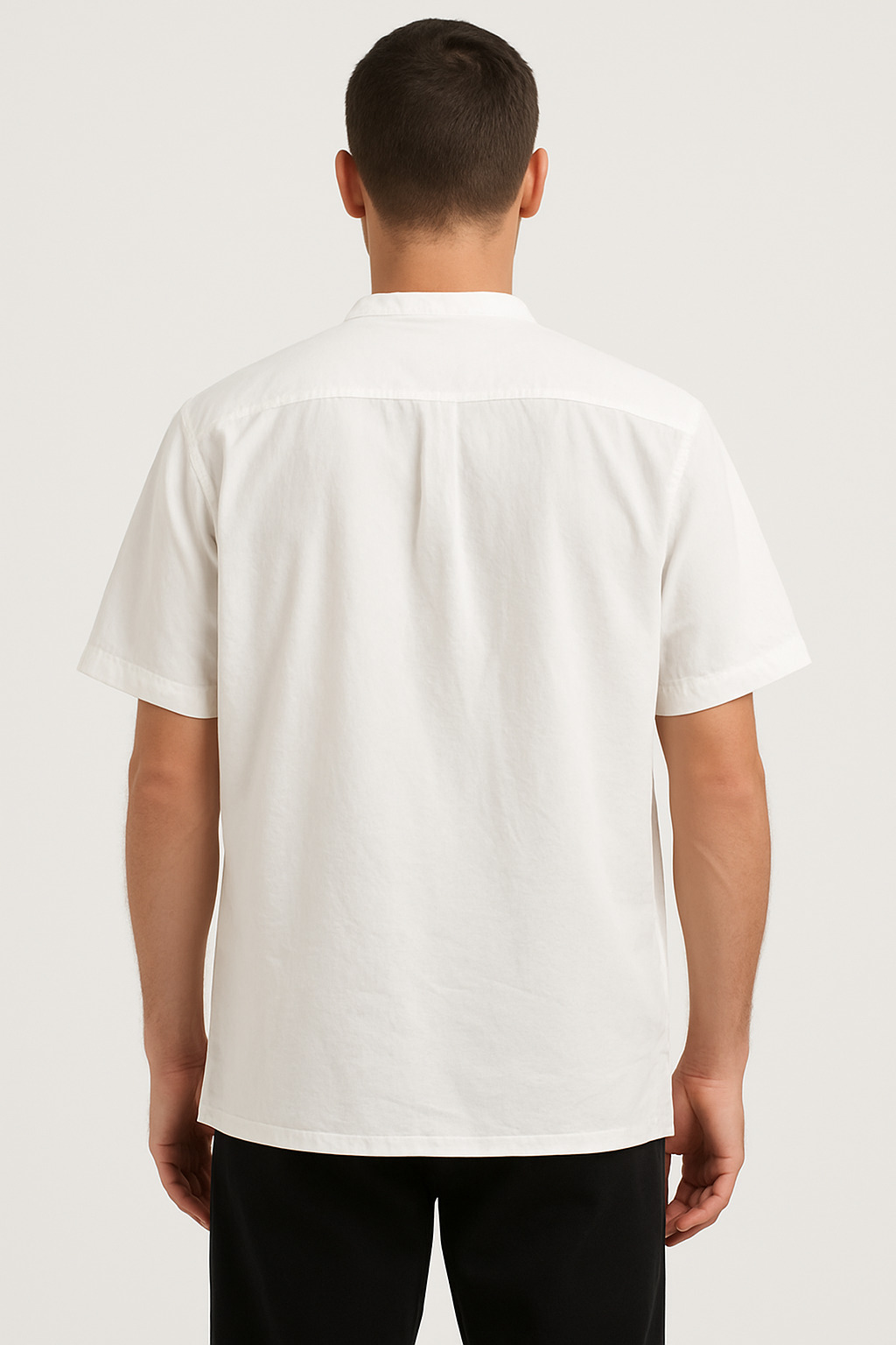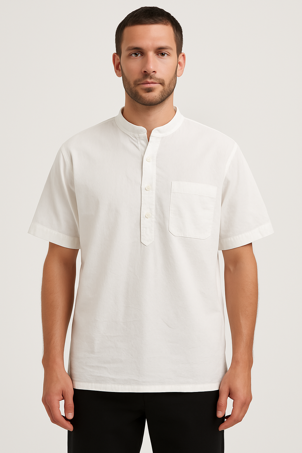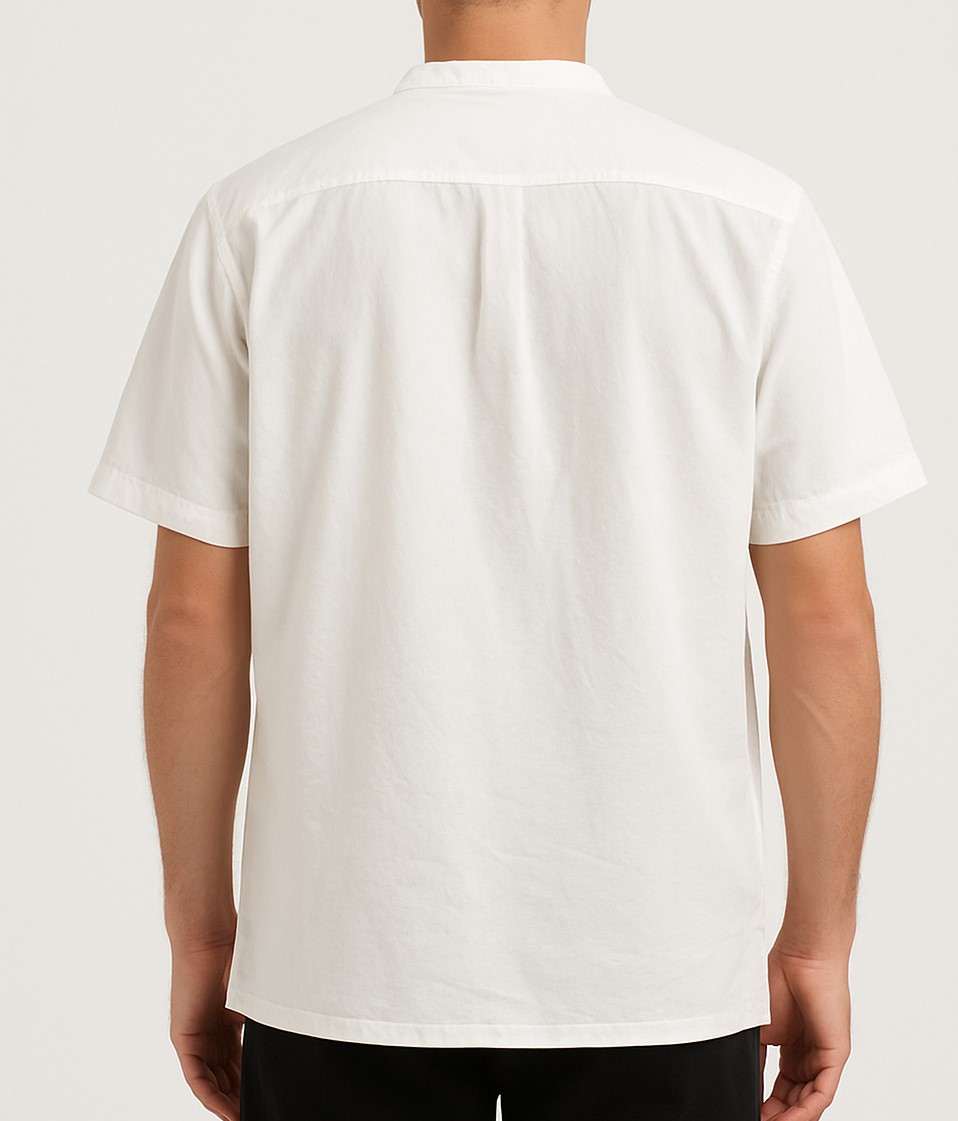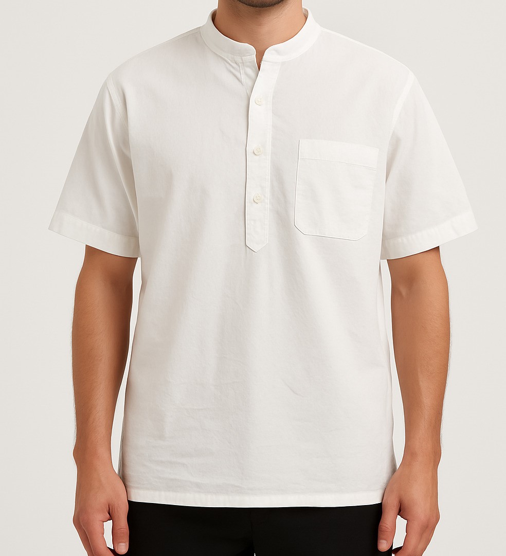 Elevate your casual wardrobe with this classic white short-sleeve shirt crafted from premium cotton fabric. Designed with a Mandarin collar and half placket featuring four buttons, this shirt offers a sleek and modern silhouette. The single chest pocket adds functionality, while the clean straight hem ensures a polished look. Ideal for both casual and semi-formal wear, this shirt combines comfort and style effortlessly.