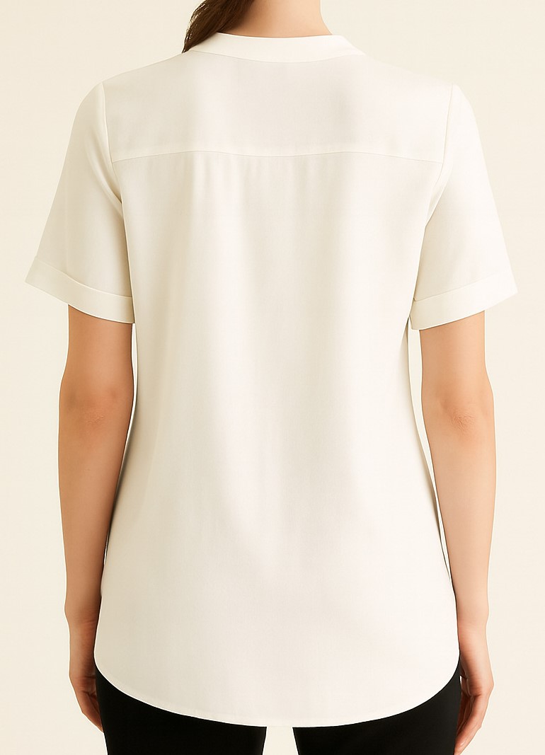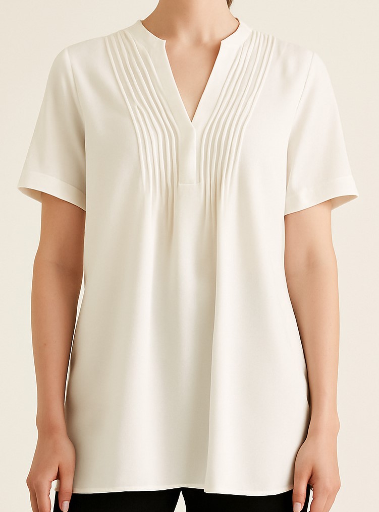 This women’s tunic top is crafted from soft and breathable fabric in a classic white shade. Designed with a pleated V-neckline, it adds subtle detailing to a minimal yet elegant look. Featuring short sleeves with folded cuffs and a relaxed longline silhouette, this tunic ensures comfort and effortless style. Perfect for both casual and semi-formal occasions, it pairs beautifully with trousers, jeans, or leggings.