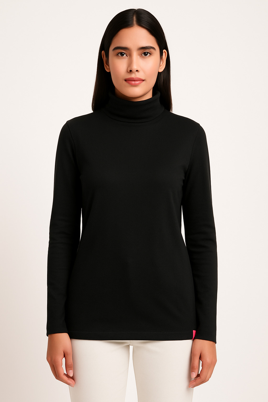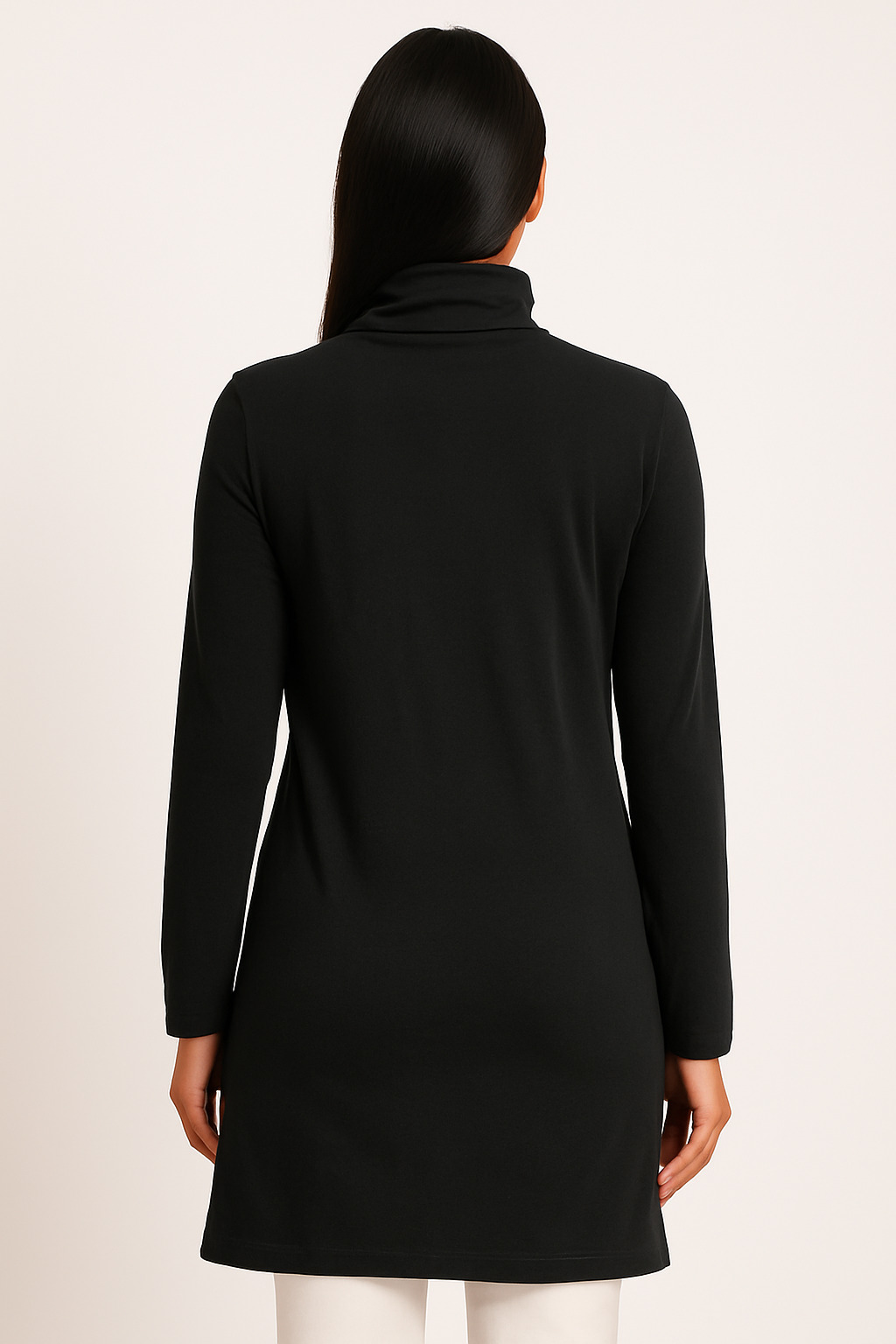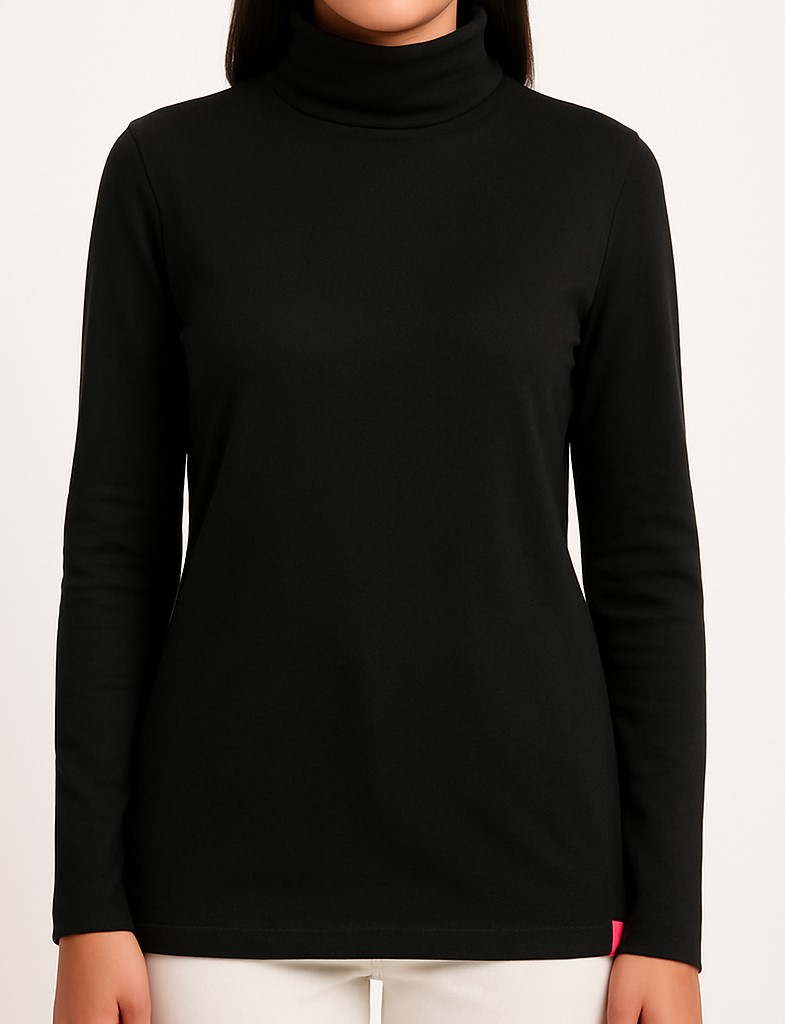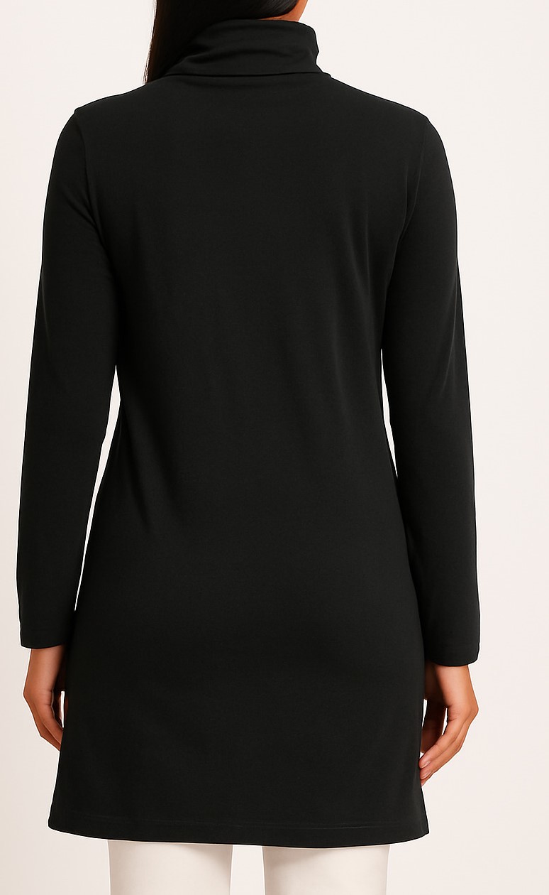 Elevate your winter wardrobe with this classic women’s black full sleeve high-neck t-shirt. Designed for both comfort and sophistication, the piece features a soft, stretchable cotton-blend fabric that hugs gently while providing warmth. The minimalistic design with a fold-over high-neck collar adds a touch of elegance, making it ideal for layering or wearing solo with jeans or trousers. Its extended tunic length offers extra coverage and versatility — perfect for day-to-night wear.