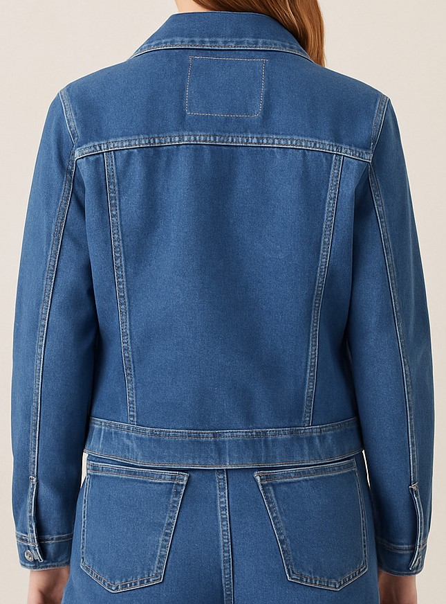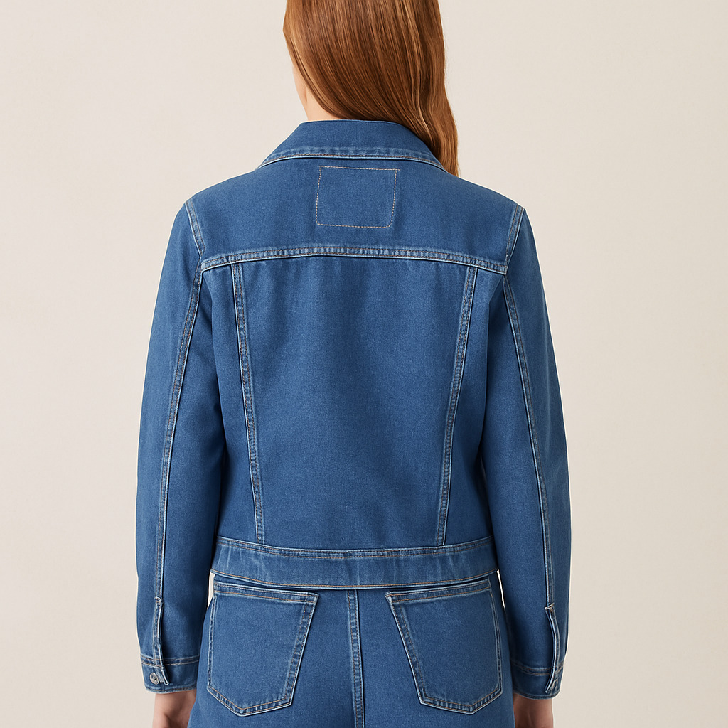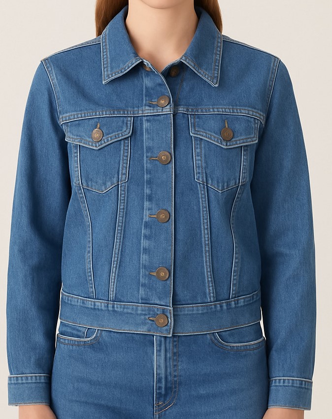 Step into timeless style with this classic women’s blue denim jacket. Crafted from durable denim fabric, this jacket features a structured silhouette with contrast stitching, a pointed collar, full front button closure, and two flap chest pockets with button detailing. The jacket’s clean back panel and adjustable waistband tabs add subtle finishing touches. Designed to pair effortlessly with jeans, skirts, or dresses, this versatile piece is ideal for year-round wear.