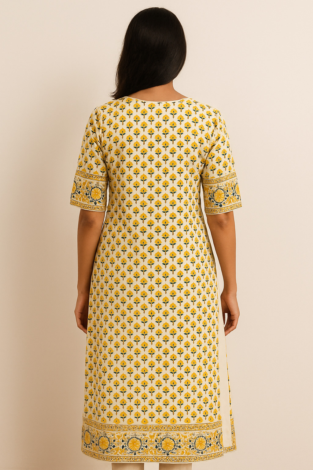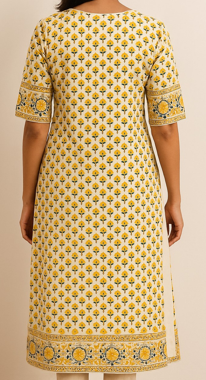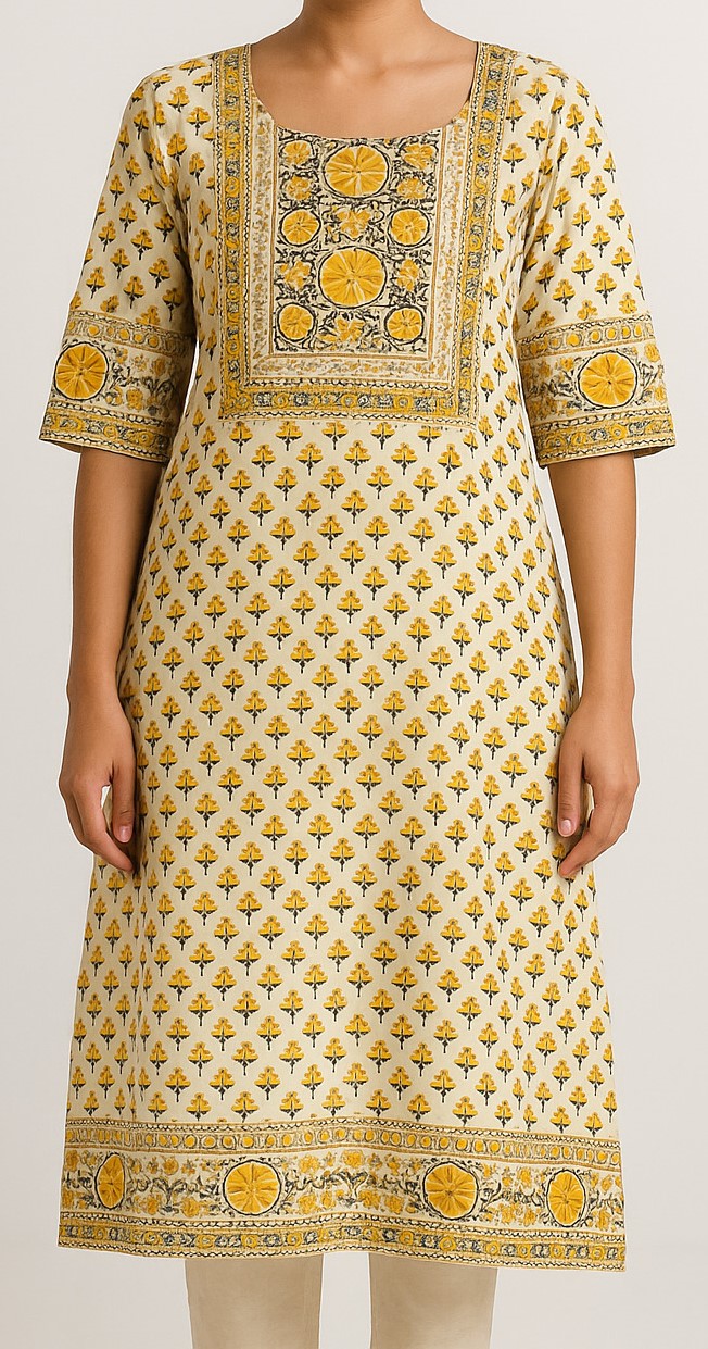 This elegant yellow floral printed straight kurta features intricate hand-block style motifs across the fabric. With a rich border accent on the hemline and sleeves and a square yoke design in front, it brings ethnic charm to your wardrobe. Crafted from comfortable cotton, it’s perfect for daily wear or casual outings. The design includes elbow-length sleeves and a straight hem, offering a relaxed yet graceful fit.